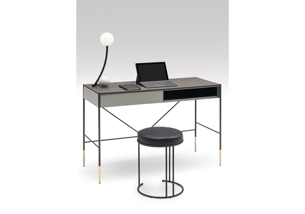 Era firmato da David Lopez Quincoces per Living Divani è uno scrittoio costituito da un corpo centrale in MDF, con pannelli esterni in MDF impiallacciato nelle essenze Stone Oak® o noce tinto canaletto oppure verniciato lucido, parte frontale suddivisa in vano a giorno e cassetto estraibile tramite guide Blum®, ripartito in 3 scomparti ad altezze e capienze differenti. Piano di appoggio in MDF sp.18 mm, con cornice in lamiera d’acciaio verniciata ottone, accoppiato al corpo centrale tramite bussole e perni.