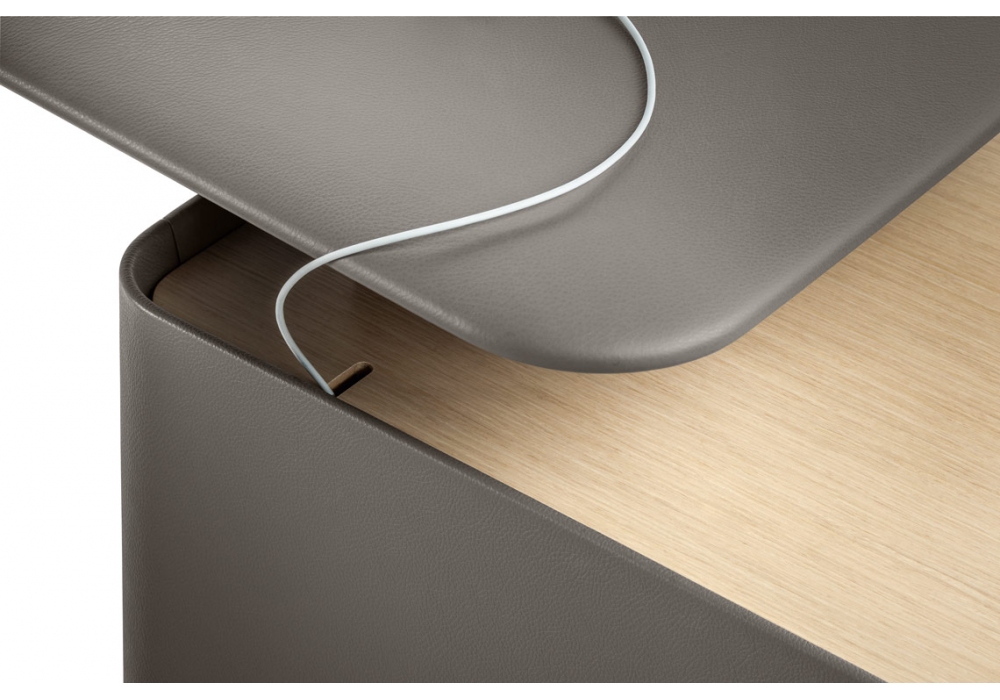 Versione piccola: Top rivestito in Pelle Frau o in cuoio. Gambe in impiallacciato rovere TW o rivestite in Pelle Frau o cuoio. Questa versione è dotata di predisposizione per la gestione dei cavi ed è disponibile con o senza cassettiera.