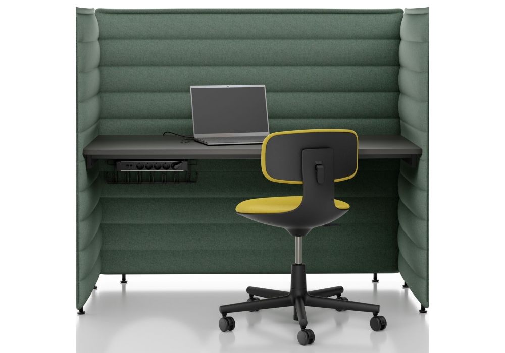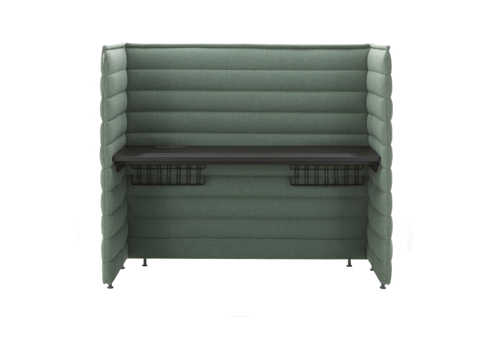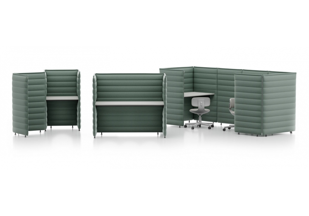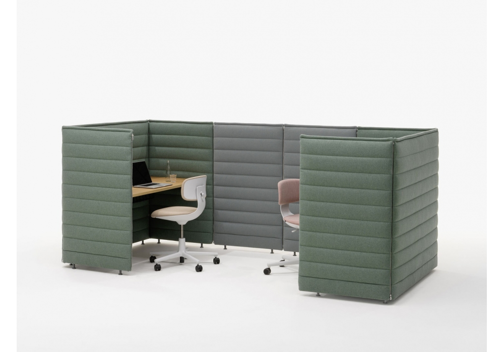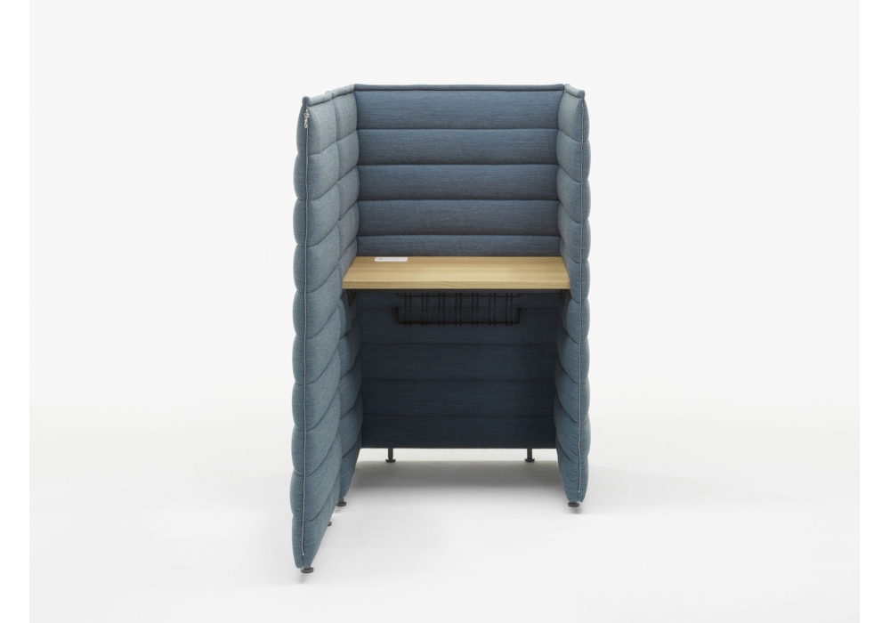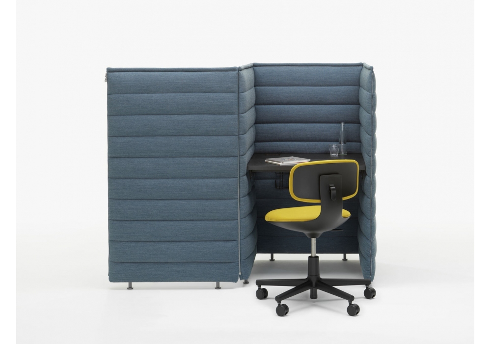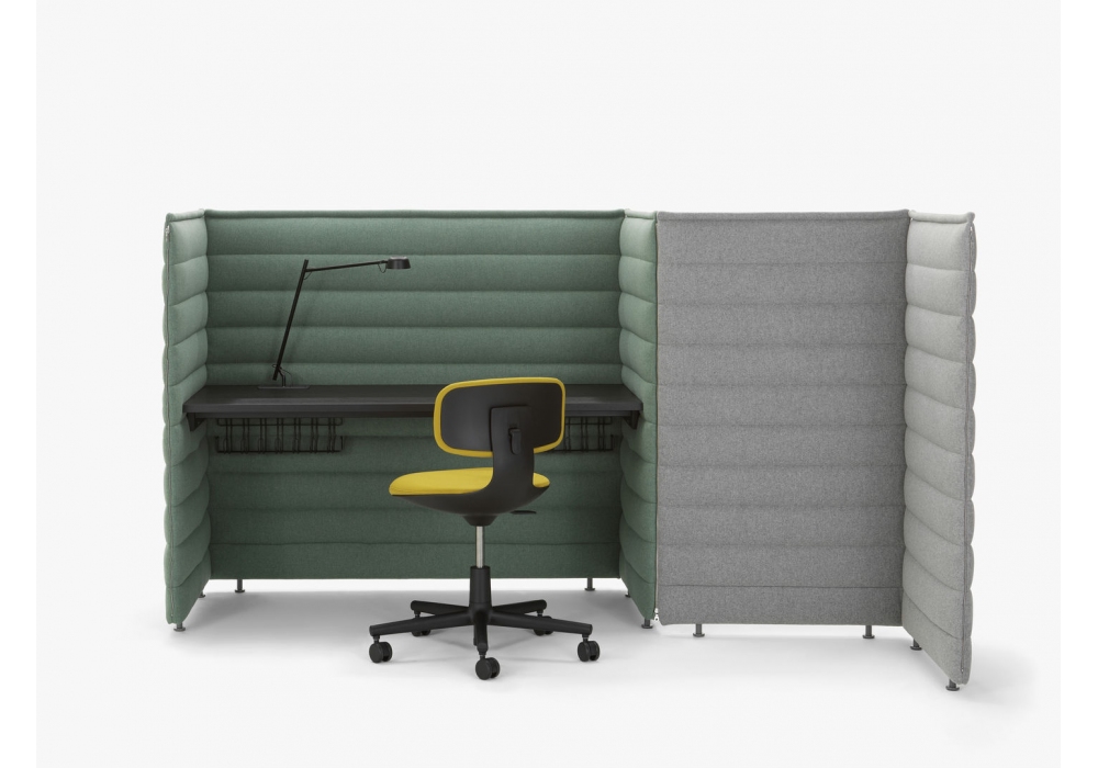 Alcove Plus Desk firmata da Ronan & Erwan Bouroullec per Vitra è scrivania realizzata con pannelli laterali e posteriori in fibra biologica e struttura metallica, collegati con cerniere. Piano in MDF, melamina o rovere. Rivestimento sfoderabile in tessuto. Su richiesta è possibile aggiungere altri pannelli ed accessori che completano la scrivania.