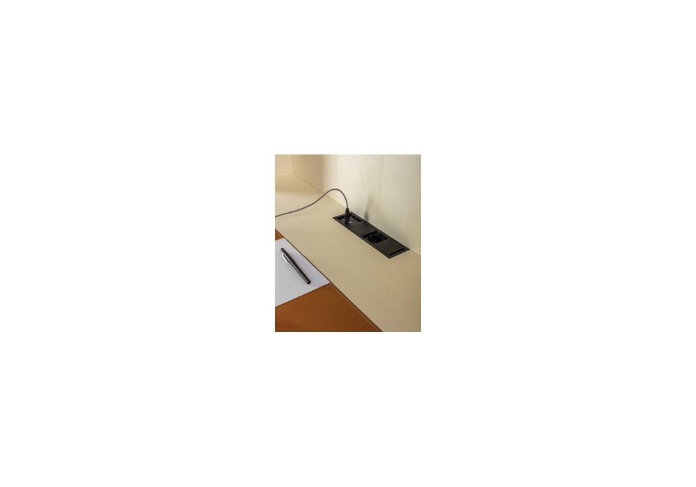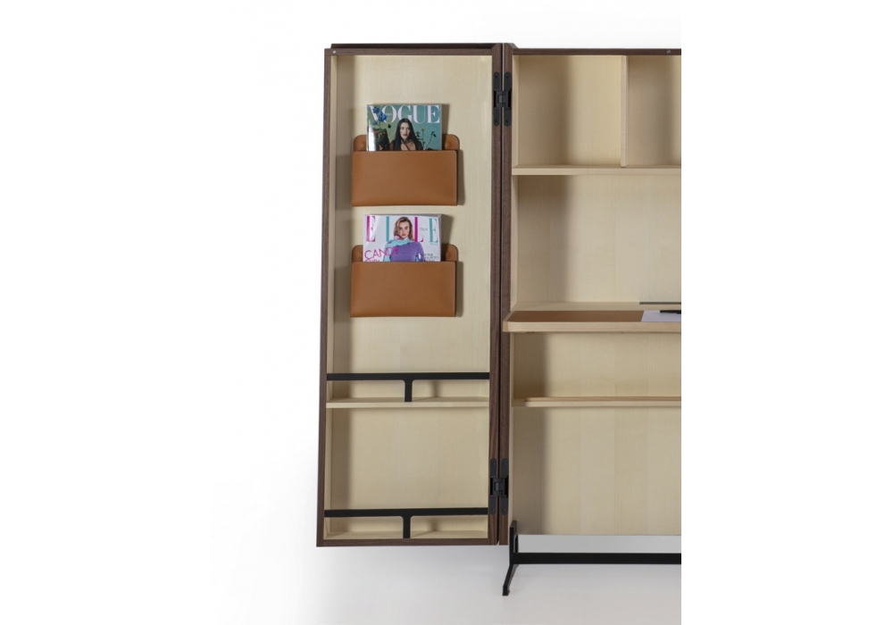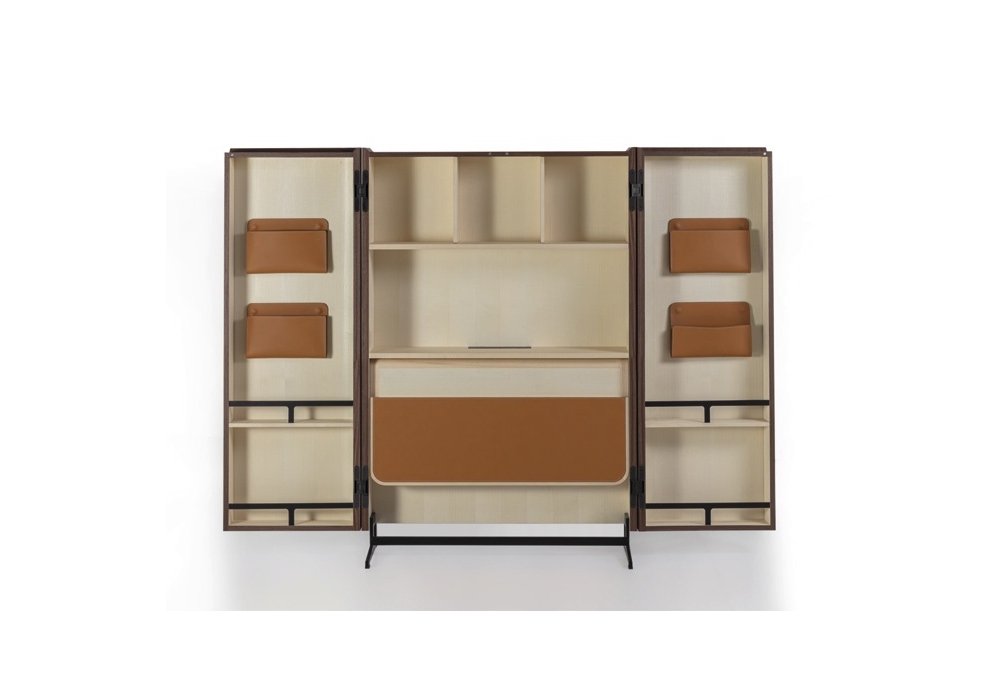 Savio firmato da D. Dolcini per Porada è un mobile scrittoio autoportante in noce canaletta con due ante e inserti in acero naturale e base ed elementi interni in metallo finitura nero opaco. Interno con piano a ribalta, mensole ed elementi contenitori in legno rivestito in Cuoietto invecchiato con passacavi elettrificato. Vano centrale provvisto di luce LED dimmerabile.
