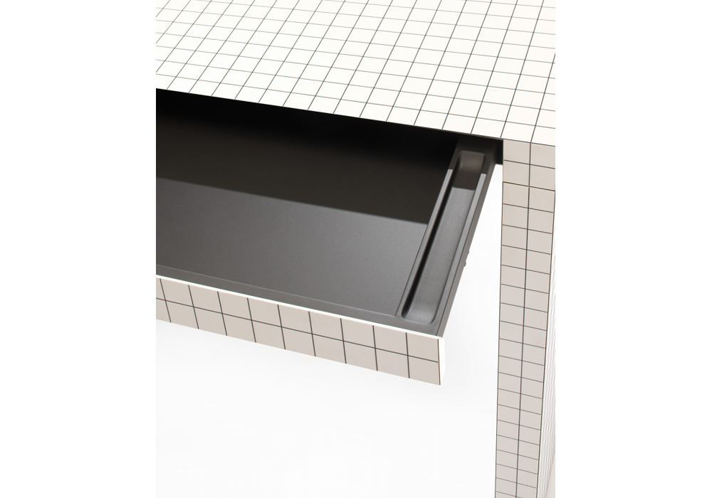 2750 Quaderna firmato da Superstudio / Cristiano Toraldo di Francia per Zanotta è uno scrittoio realizzato con struttura in legno tamburato placcato laminato Print, colore bianco, a stampa digitale a quadretti. Cassetto estraibile a scomparsa ricavato nello spessore del piano, vano cassetto in legno verniciato goffrato antigraffio colore nero.