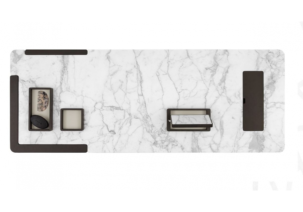 Edward firmato da Dainelli Studio per Giorgetti è uno scrittoio con struttura in frassino, in diverse finiture. La base è rivestita in pelle, nella parte centrale, in vari colori. Il piano è in marmo o frassino, con finiture a scelta. E' possibile selezionare diversi kit di accessori interni ed esterni.
