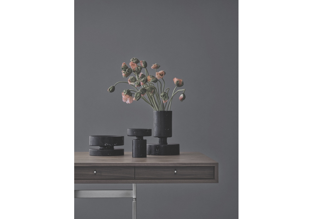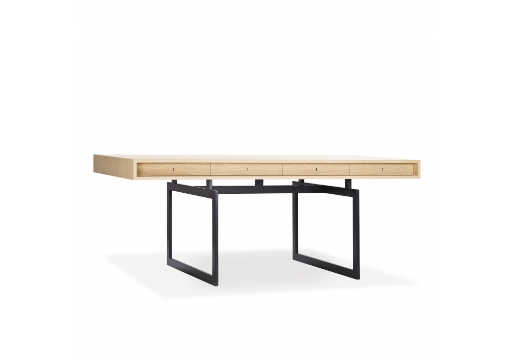 Office Desk firmata da Bodil Kjær per Karakter è una scrivania con struttura in acciaio rivestito a polvere o acciaio inossidabile spazzolato e piano impiallacciato rovere o noce con lacca trasparente.