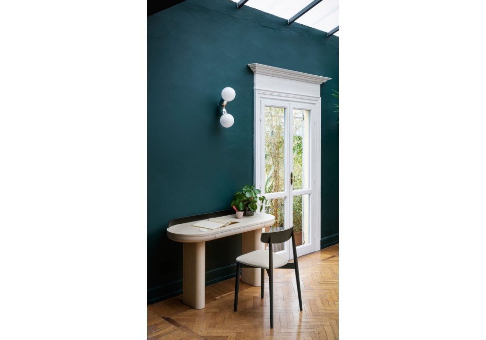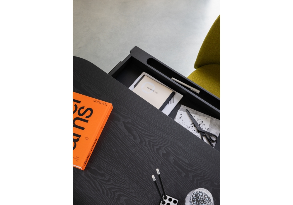 Jumbo firmato da Paolo Cappello per Miniforms è uno scrittoio con piano e gambe in frassino, fascia metallica in oro rosa opaco, zincato o laccato, disponibile in diverse finiture.
