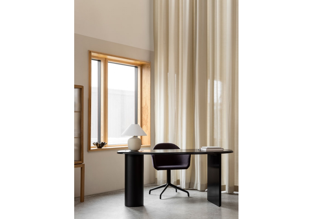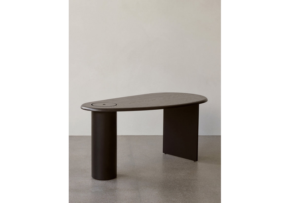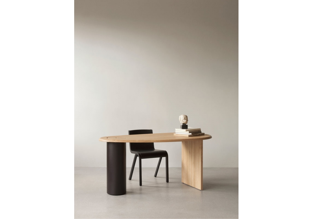 The Eclipse firmata da Fred Rigby Studio per Audo Copenhagen è una scrivania realizzata in rovere, disponibile in diverse finiture e colonna in acciaio nero che funge anche da contenitore.