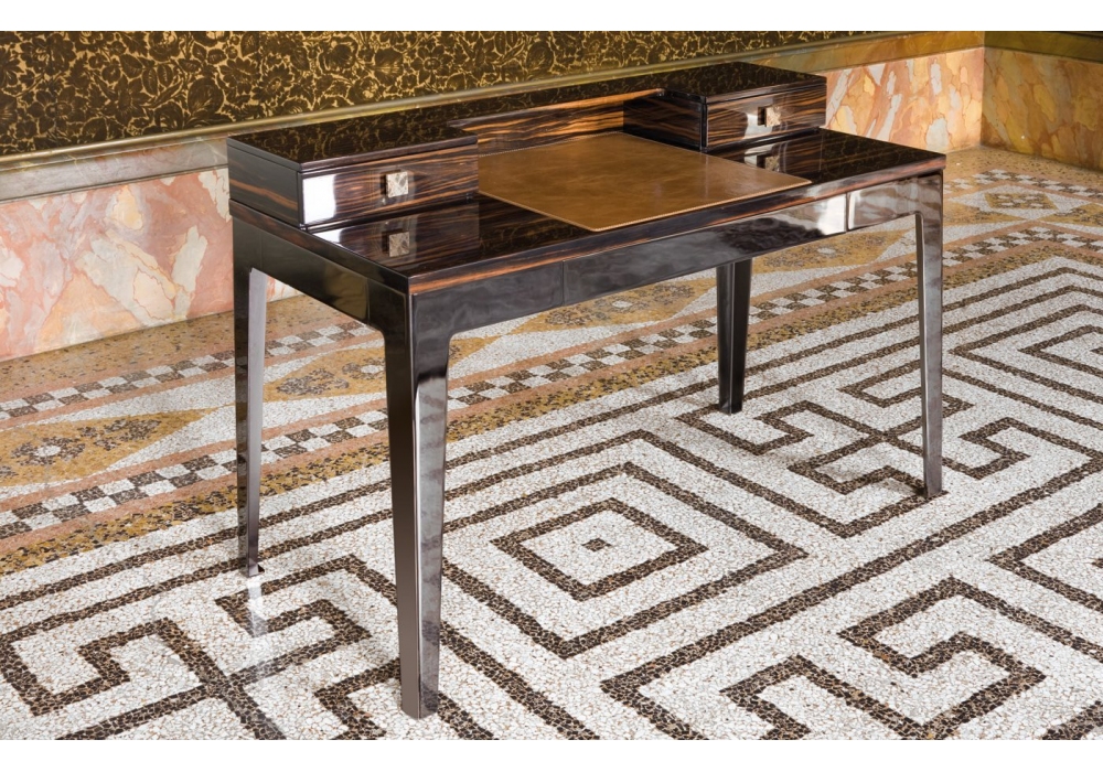 William firmata da Giuseppe Viganò per Longhi è una scrivania con struttura in legno o laccata lucida e base in metallo. Piano scrittoio ed interno cassetti rivestiti in pelle. Maniglie a scelta marmo o cuoio.