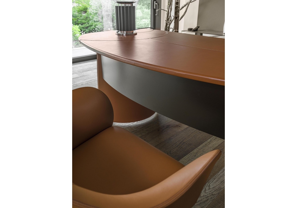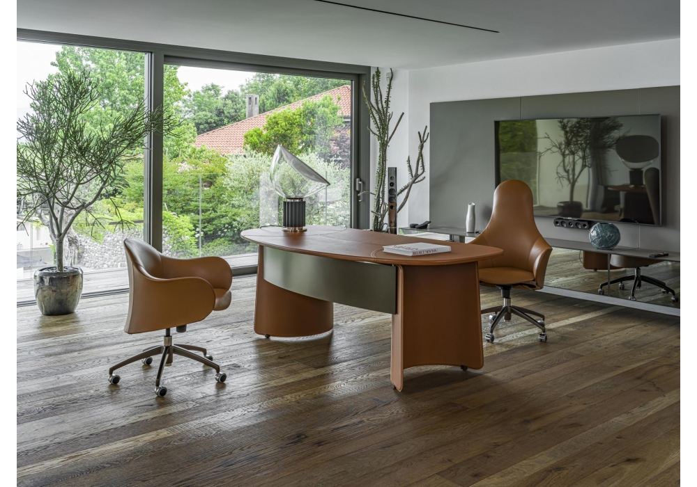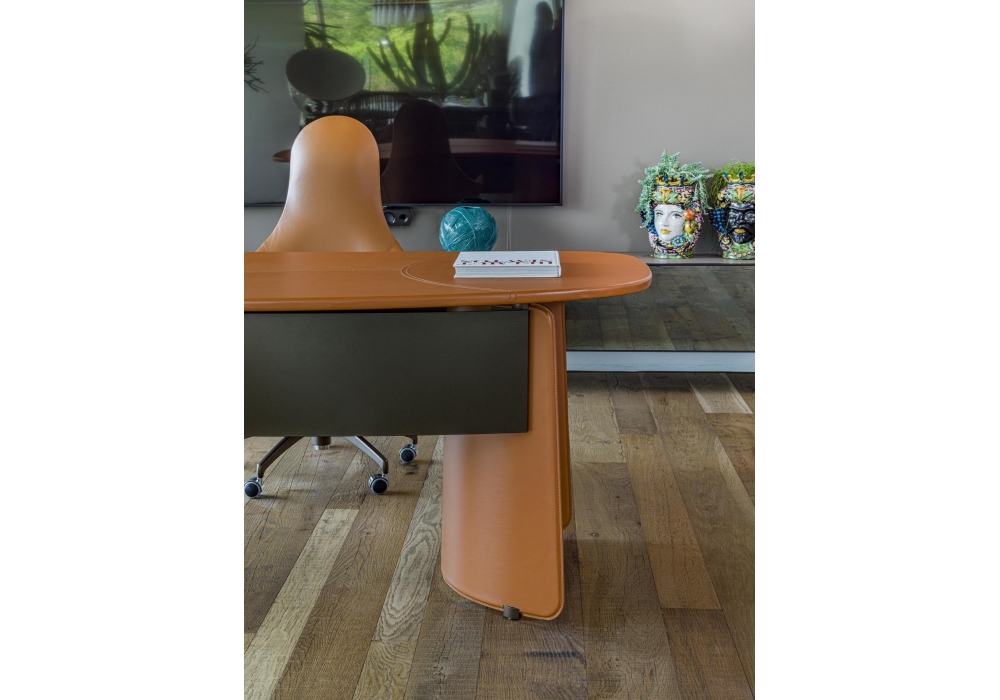 Butterfly firmata da Studio Nove.3 per Enrico Pellizzoni è una scrivania con struttura in lamiera piegata rivestita in cuoio. Piano disponibile in vetro, rivestito completamente in cuoio o in essenza con rivestimento centrale in cuoio.