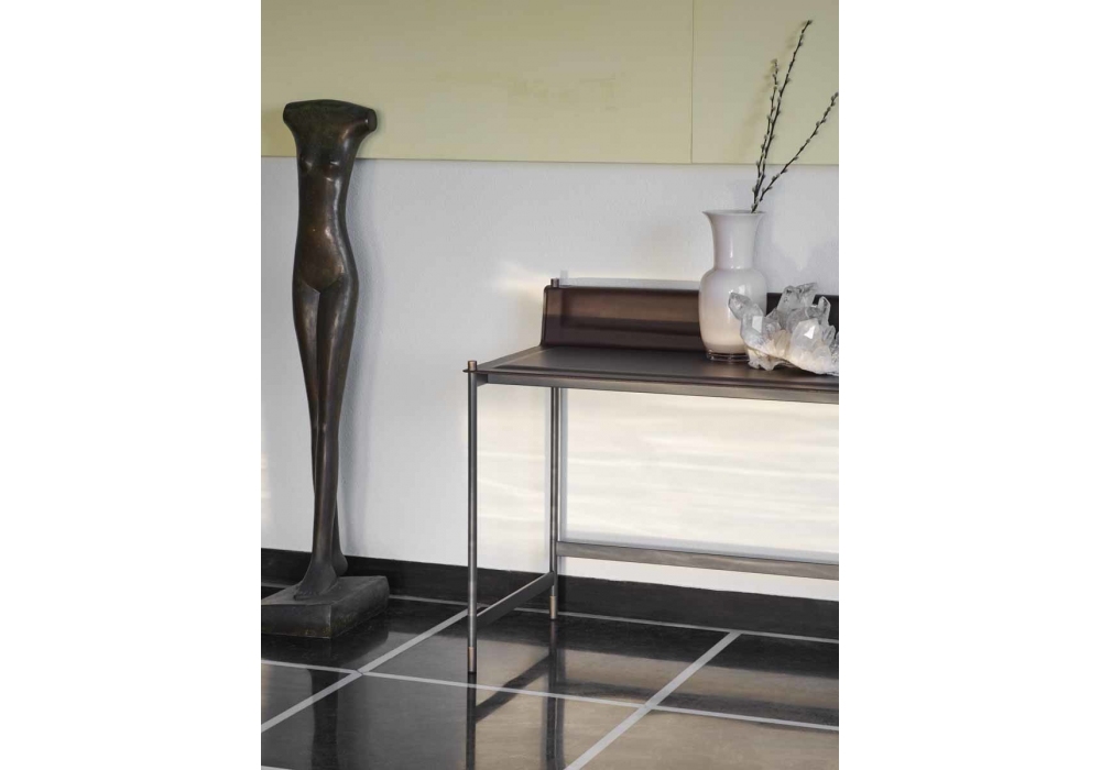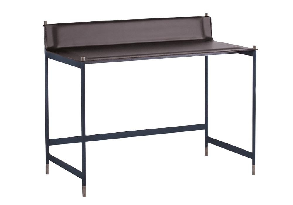 Terrazzo firmato da Nicola Bonriposi per Potocco è uno scrittoio con struttura in acciaio tubolare verniciato a polvere in finitura antracite goffrato con dettagli piedini e dettagli cilindrici di fissaggio del piano in finitura ottone brunito. Piano con inserto soft pad in poliuretano espanso, rivestito in cuoietto e rifinio da cuciture perimetrali a vista.