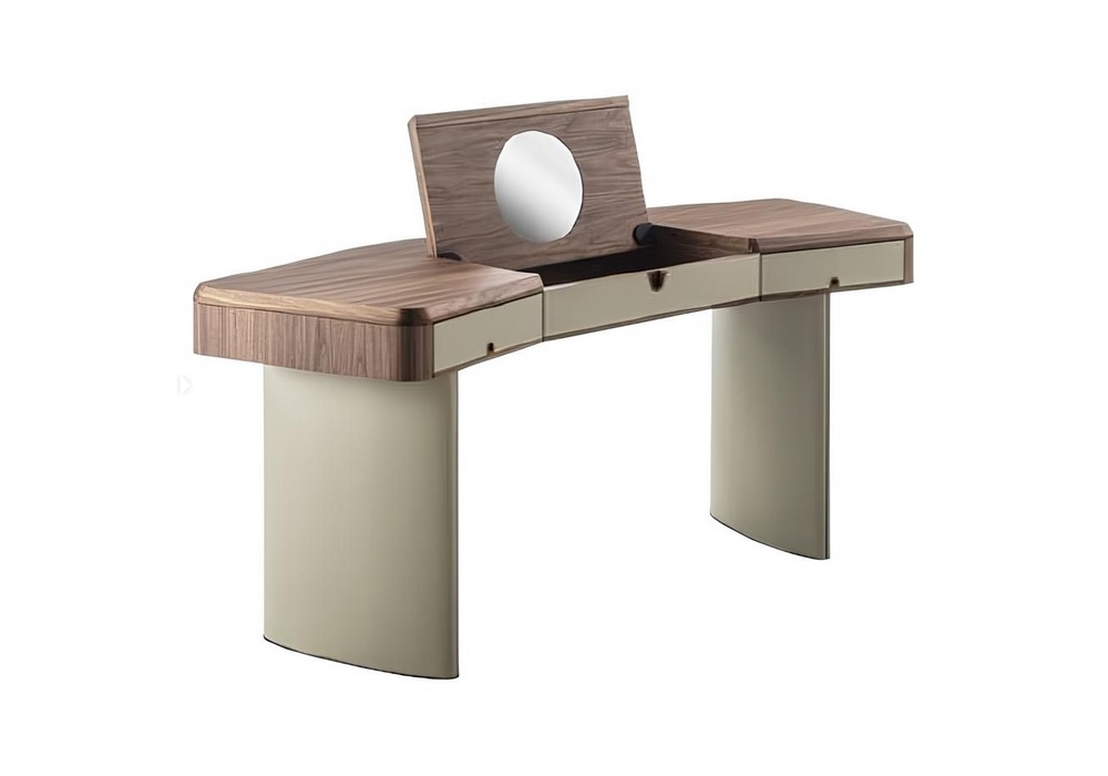 Moty firmato da Umberto Asnago per Porada è uno scrittoio con gambe rivestite in Cuoietto come il retro del piano, i frontali dei cassetti, la ribalta e il fondo del vano portaoggetti. La parte in legno è realizzata in noce canaletta. Dettagli in metallo Bronzoro.