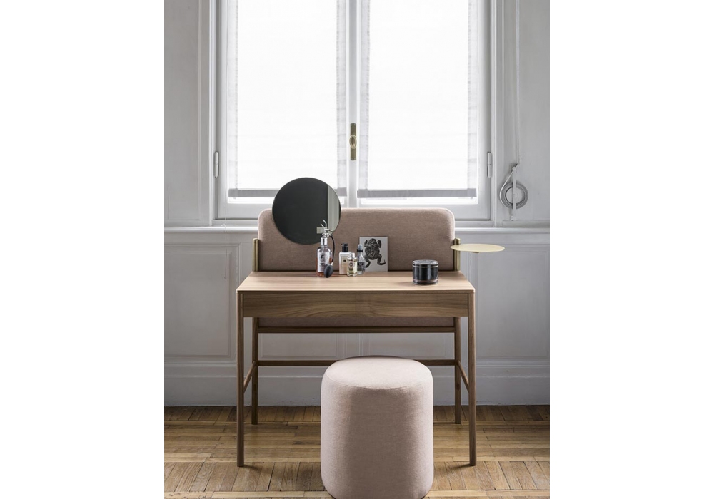 Flag firmato da Ruga Perissinotto per Bolzan è un elegante scrittoio beauty con struttura in legno, disponibile in noce Canaletto o frassino, con finiture in rovere o wengé. Il pannello posteriore è rivestito in tessuto. I dettagli in ottone satinato aggiungono un tocco di classe e raffinatezza. La particolarità di questo scrittoio risiede nella sua funzionalità: oltre ad essere una postazione di lavoro pratica, è anche un beauty desk pensato per chi desidera unire estetica e utilità.