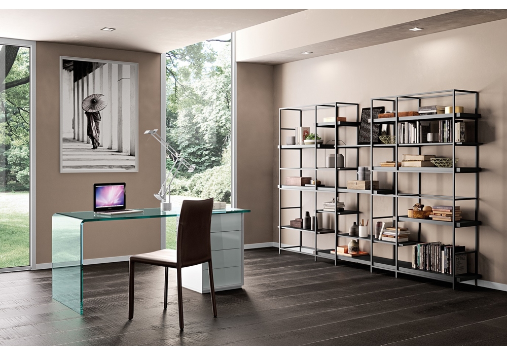 Rialto L firmata da CRS Fiam è una scrivania in vetro curvato, abbinata ad una cassettiera in legno laccato opaco nei colori bianco o nero con frontali in vetro verniciati in abbinamento al colore della struttura.