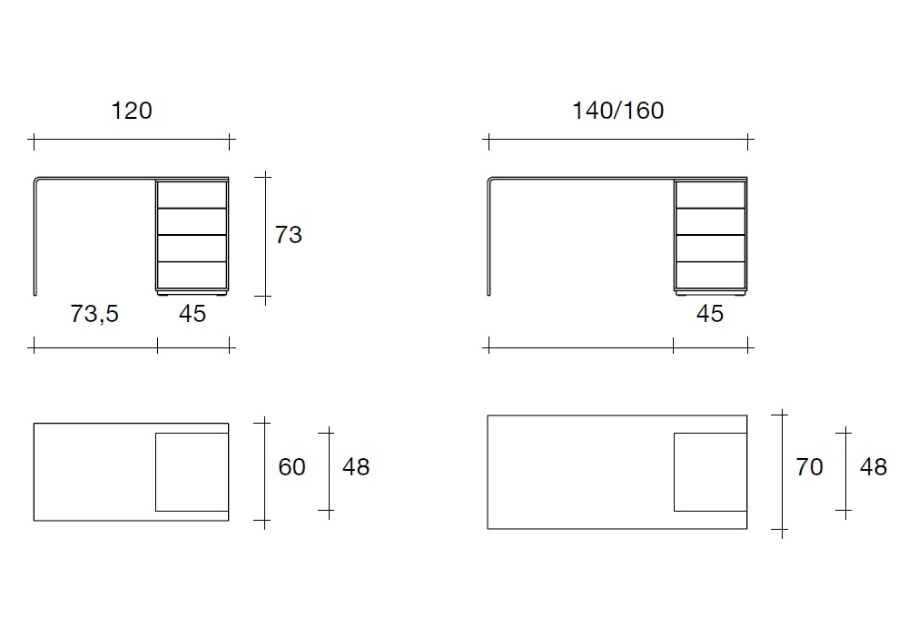 | Dimensioni | 120 x 60 x H 73 cm; 140 x 70 x H 73 cm; 160 x 70 x H 73 cm. |