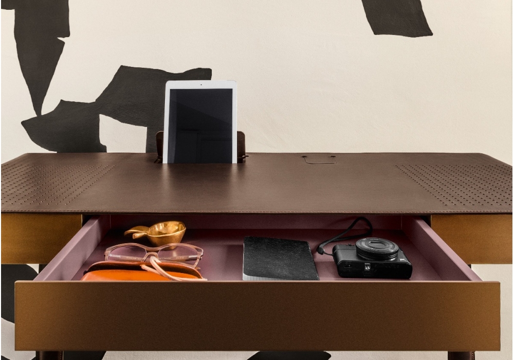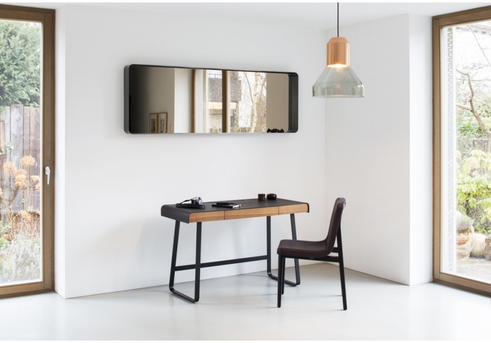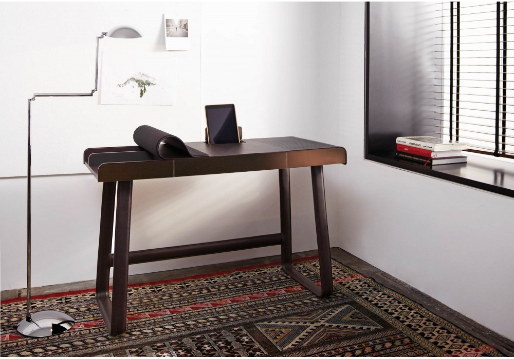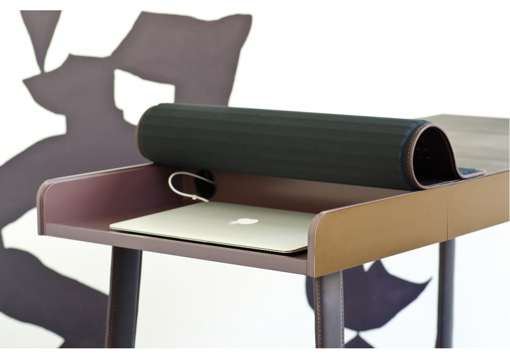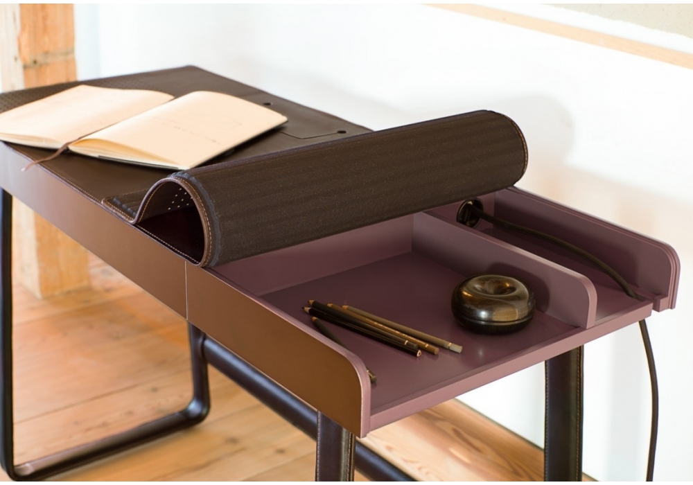 Pegasus firmato da Ippolito Fleitz Group/Tilla Goldberg per ClassiCon è uno scrittoio realizzato con struttura in acciaio, laccato nero o rivestito in cuoio curvato nei colori moka. Scocca con cassetto e quattro vani in HPL / MDF laccato opaco malva o blu notte. Parte anteriore e posteriore rivestita in lamiera di acciaio inox brunita o massello di noce, con vernice trasparente. Piano di lavoro rinforzato in pelle curva, lato inferiore rivestito in tessuto nero ripiegabile lateralmente.