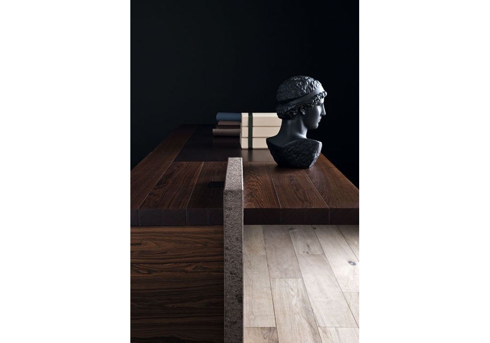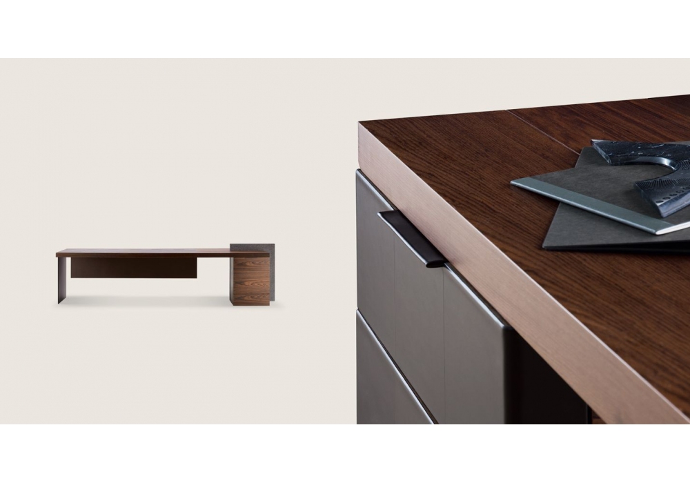 H_O Desk Lac firmata da Claudio Silvestrin per Poltrona Frau è una collezione di scrivania. Piano di forte spessore realizzato con una tecnica “sandwich” con anima in multistrato di pioppo ed esterno in MDF, privo di fughe e caratterizzato da una laccatura lucida nei colori bianco e nero. Il sottomano, realizzato con un pannello in MDF, è sempre rivestito in Pelle Frau® del Color System in abbinamento alla gamba realizzata in metallo e rivestita in pelle. L’appoggio a terra avviene tramite piedini in materiale plastico. Sul lato opposto alla gamba le desk montano una colonna in Travertino bianco o in Ardesia con finitura naturale. La cassettiera, posizionabile a destra o a sinistra rispetto alla posizione dell’utilizzatore e comunque sempre sul lato della colonna, ha la struttura in multistrato di pioppo impiallacciato in essenza di Louro Preto o Rovere tortora con frontale nella stessa essenza. La cassettiera, nella configurazione standard, è composta da un cassetto e da un classificatore. Sul piano, in prossimità della colonna, è presente un’apertura che permette la fuoriuscita dei cavi elettrici. Le desk H_O Lac possono essere accessoriate con pannello di cortesia rivestito in Pelle Frau® del Color System.