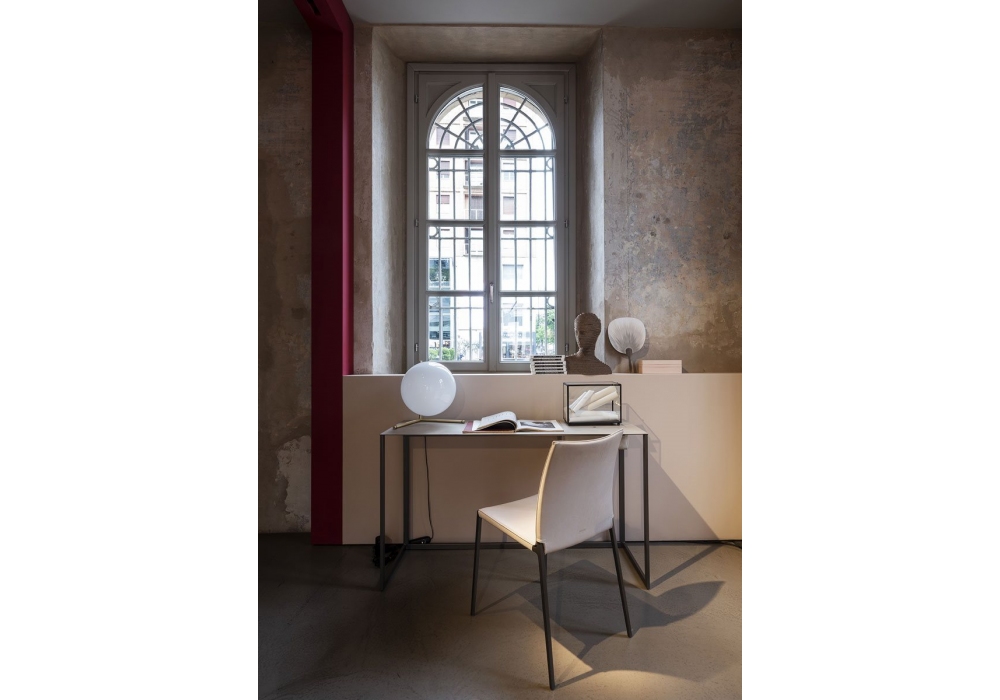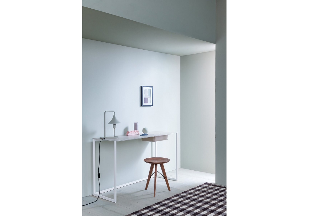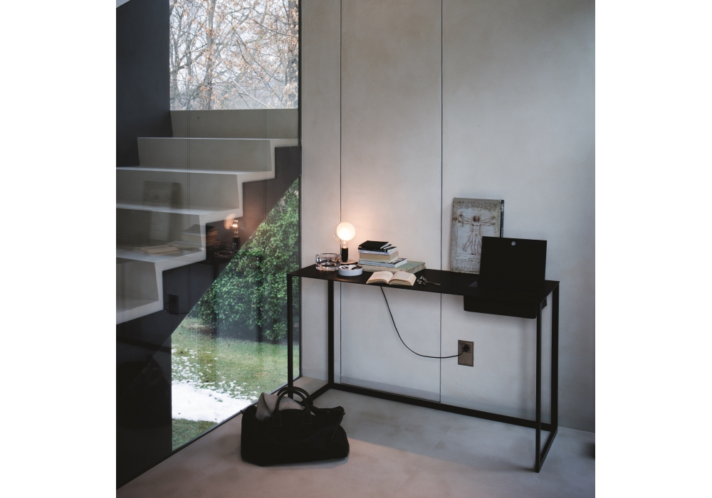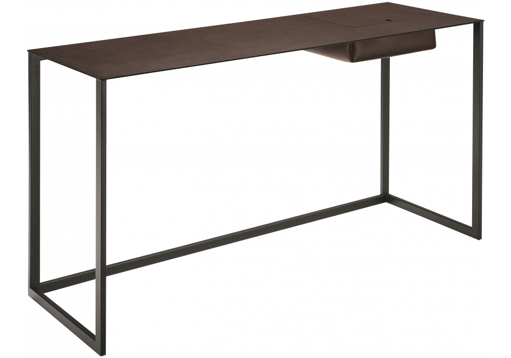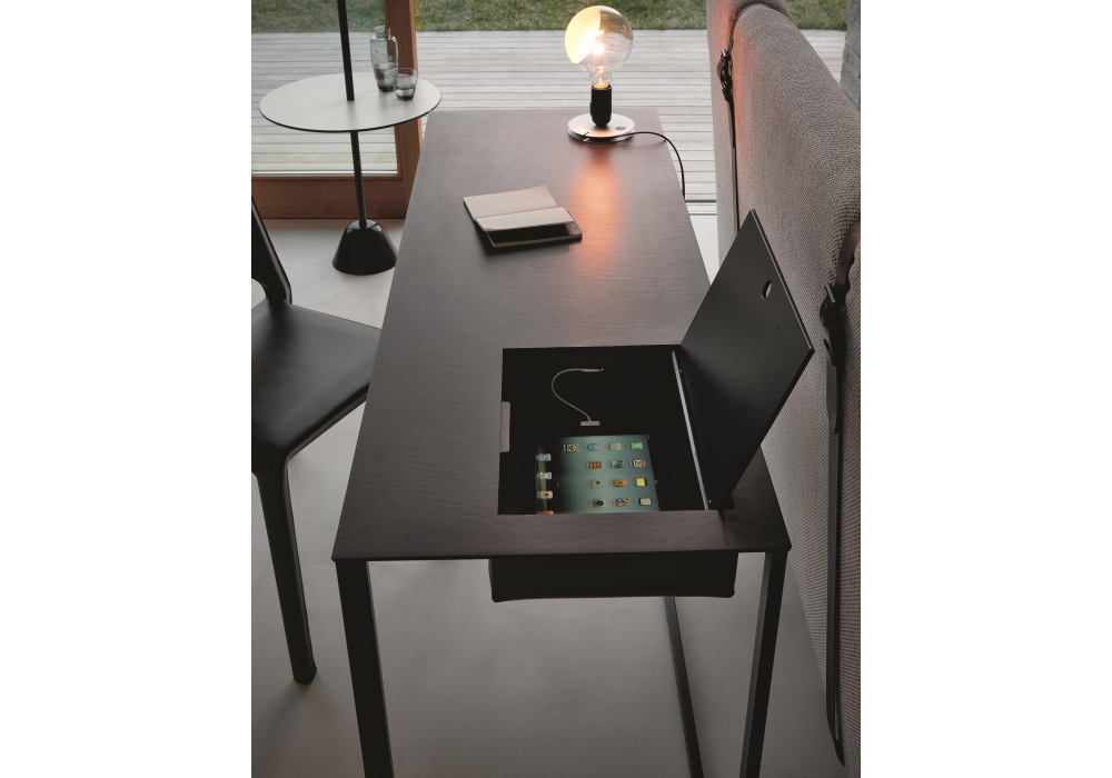 2730 Calamo firmata da Gabriele Rosa per Zanotta è una scrivania con struttura e piano in acciaio verniciato colore bianco, nero o grafite. Piano e vano portaoggetti in cuoio pigmentato 90. Il vano è accessibile mediante apertura a ribalta.