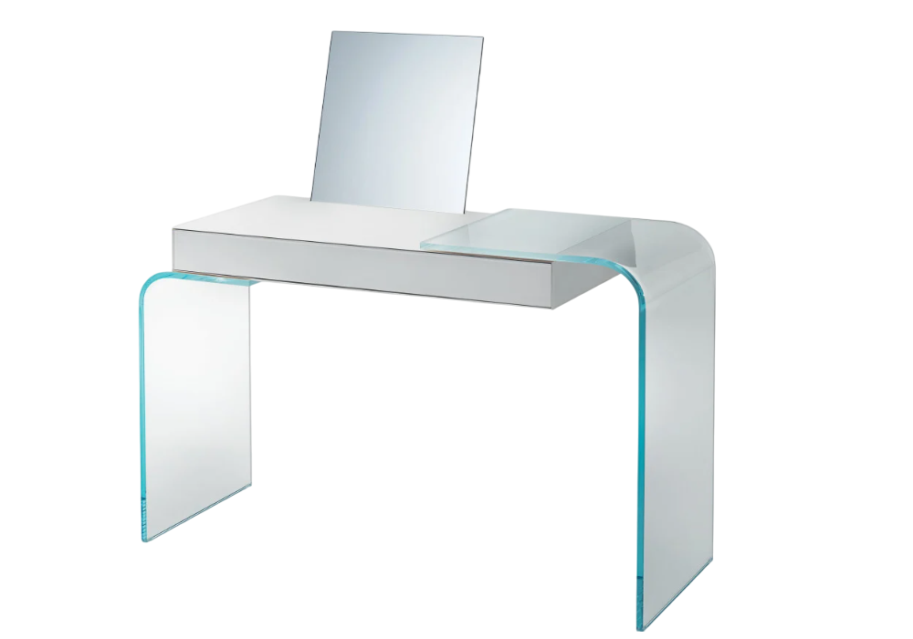 Strata firmata da Yabu Pushelberg per Glas Italia è una scrivania con gambe in cristallo extrachiaro curvato. Il piano è rivestito in cristallo temperato laccato lucido o opaco e dispone di un cassetto con apertura push-pull- Nel piano è presente una fresata passacavi, in cui può essere inserito uno specchio bifacciale.