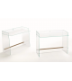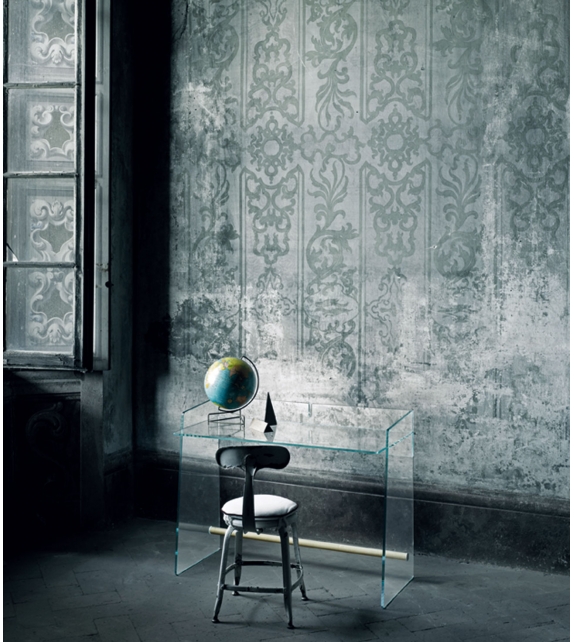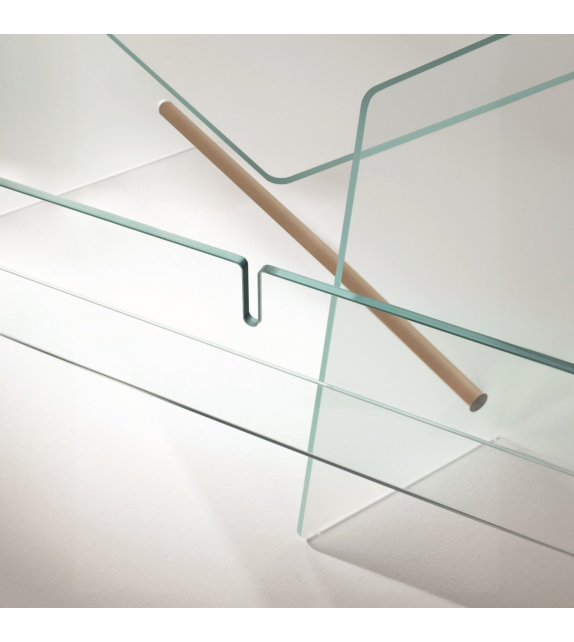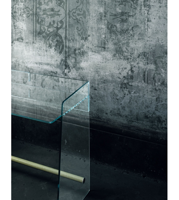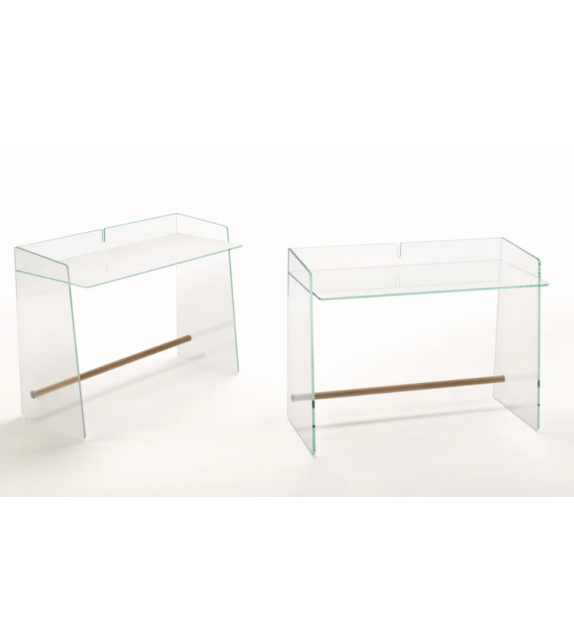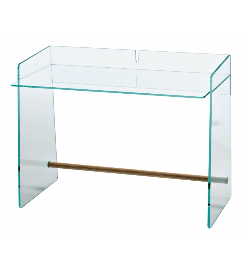 Pirandello firmata da Jasper Morrison per Glas Italia è una scrivania in cristallo trasparente extralight, temperato e termosaldato, disponibile in due diverse misure. É dotata di una barra poggiapiedi in legno di frassino naturale.