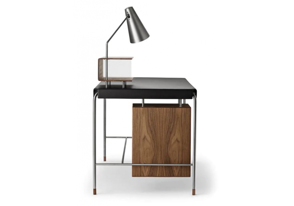 AJ52 Society Table firmata da Arne Jacobsen per Carl Hansen & Søn è una scrivania con struttura in acciaio, piedini in legno, piano con rivestimento in pelle Freja e cassetti in legno di rovere o noce. Disponibile in due dimensioni. Contenitore realizzato in legno e vetro con annessa lampada in acciaio.