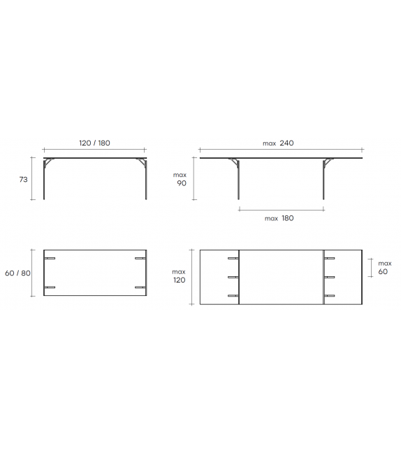 | Dimensioni | 120 x 60 x H 73 cm; 130 x 60 x H 73 cm; 140 x 70 x H 73 cm; 160 x 70 x H 73 cm; 180 x 80 x H 73 cm. |