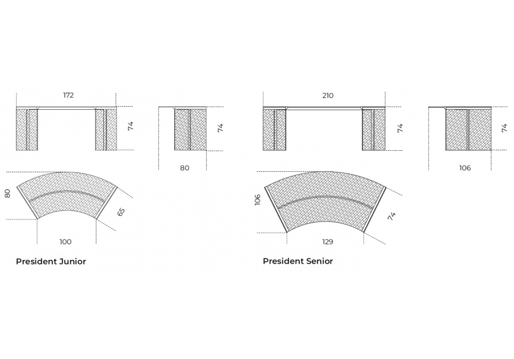 | Dimensioni | 172 x 80 x H 74 cm (President Junior); 210 x 106 x H 74 cm (President Senior). |