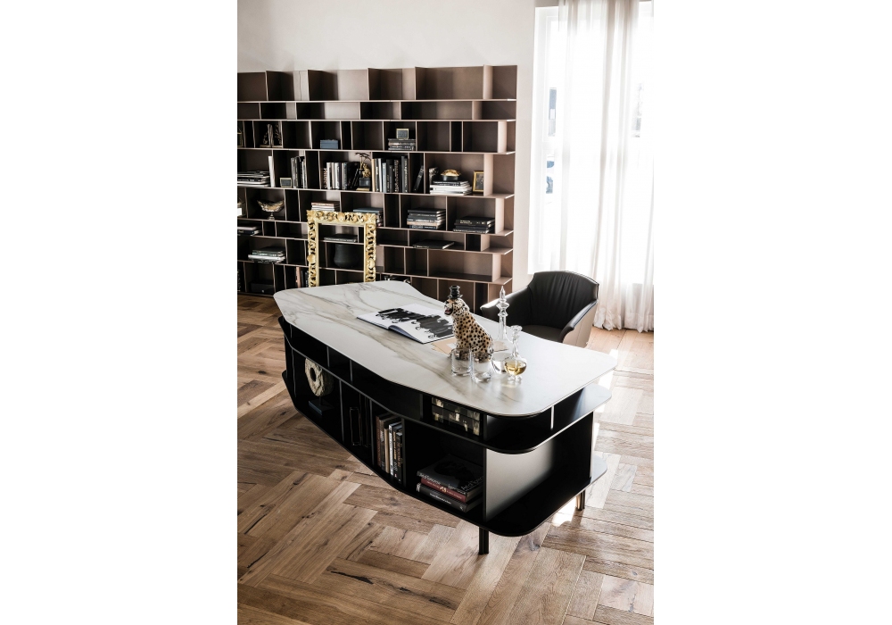 Wall Street firmata da Alessio Bassan per Cattelan Italia è una scrivania con piano in ceramica Marmi in diversi colori. Struttura in MDF laccato goffrato nero.
