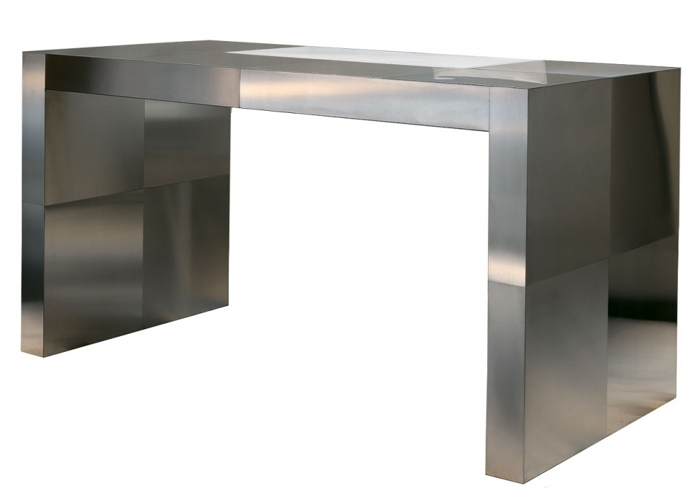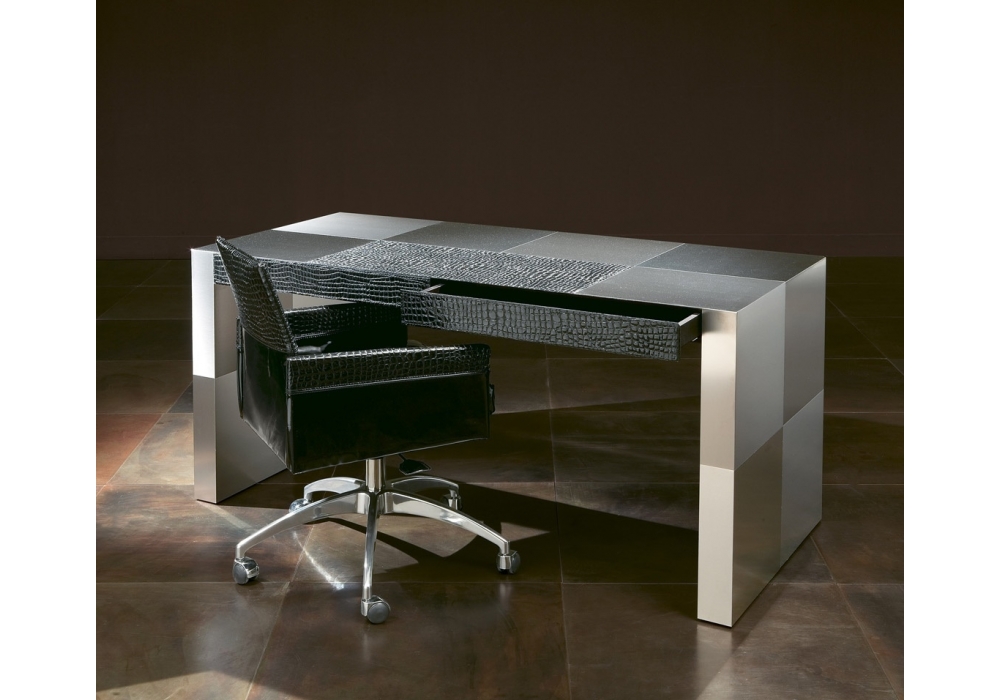 Florida Lux firmata da Rugiano è una scrivania rivestita in pelle con due cassetti. Struttura in acciaio o bronzo.