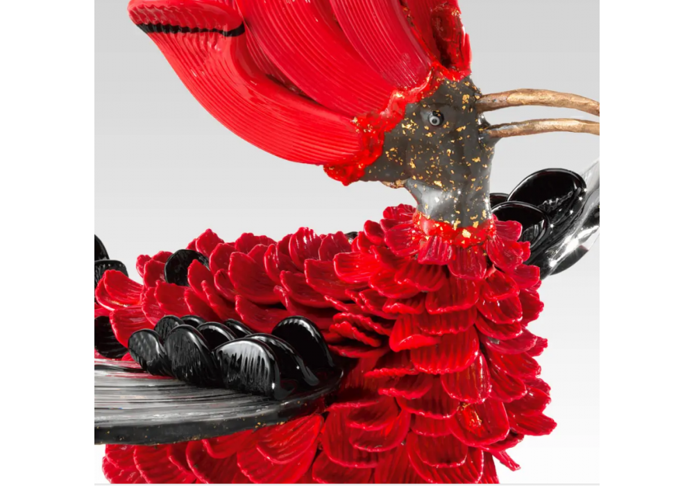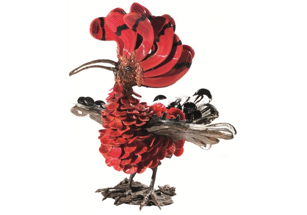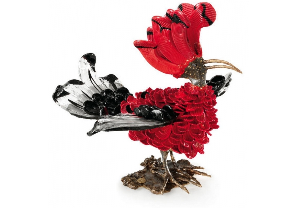 Upupa firmata da Toni Zuccheri per Venini è una scultura con struttura in bronzo con piume in vetro modellate a mano con tecnica mista. Edizione numerata per anno.