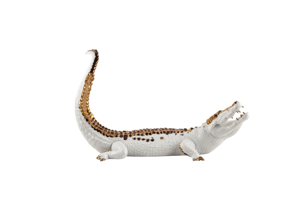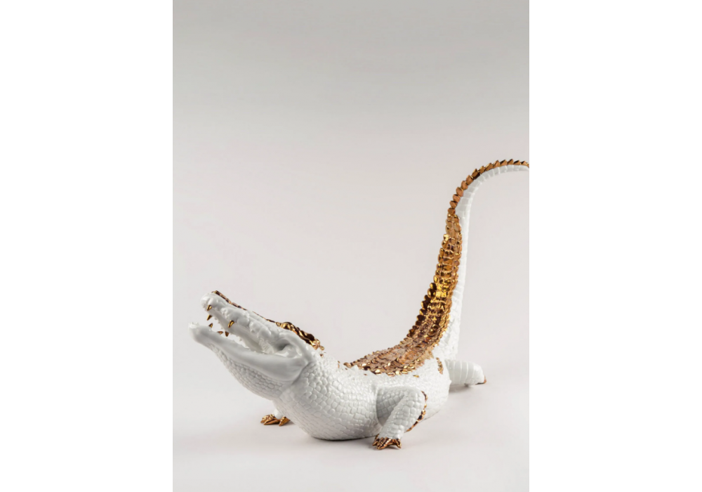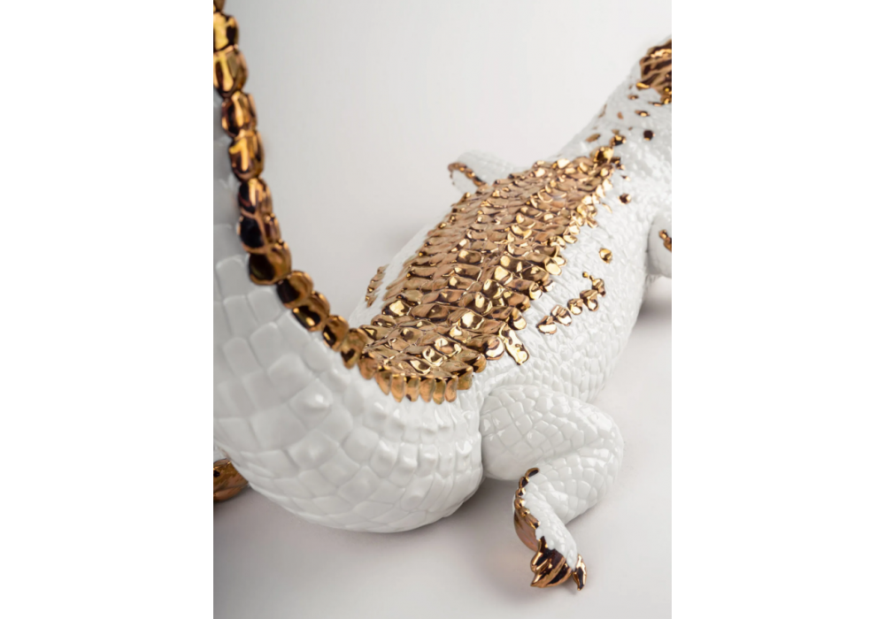 Crocodile firmato da Raul Rubio per Lladró è una scultura in porcellana bianca smaltata e decorata con dettagli dorati.