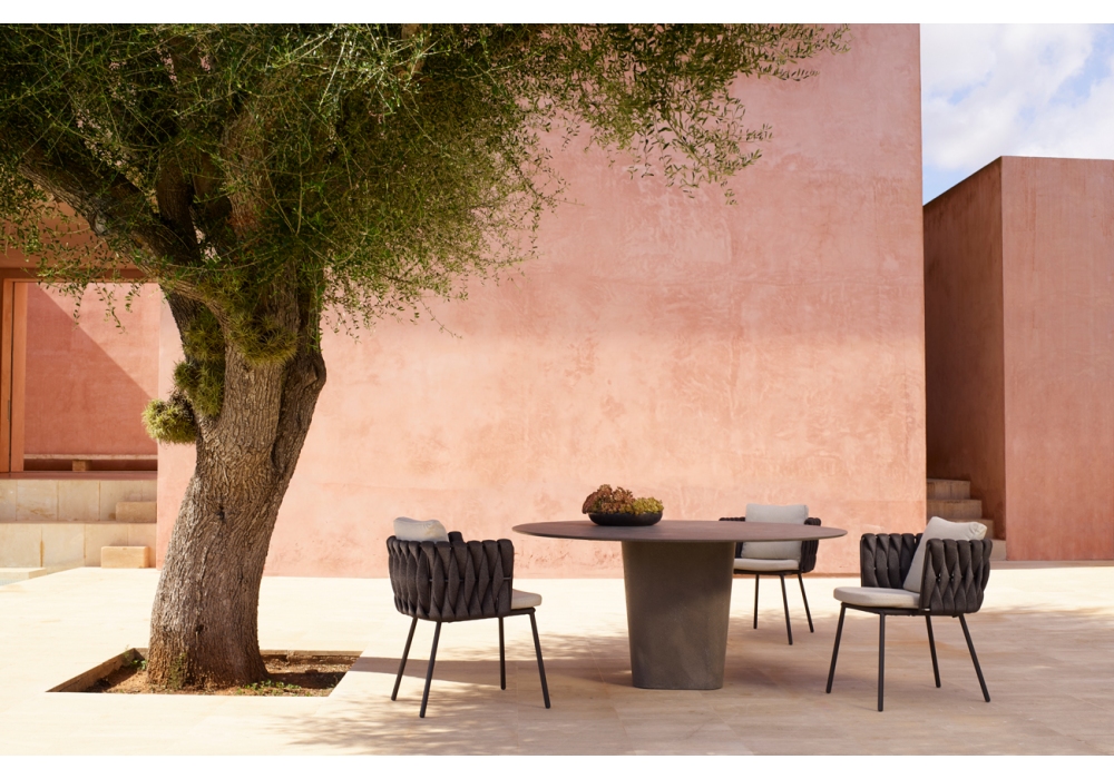 Tosca firmata da Monica Armani per Tribù è una sedia con struttura in inox con verniciatura a polvere e rivestimento tubolare intrecciato in textilene e poliolefine. I cuscini di seduta e schienale sono disponibili con diversi tipi e colori di rivestimento.