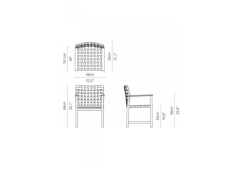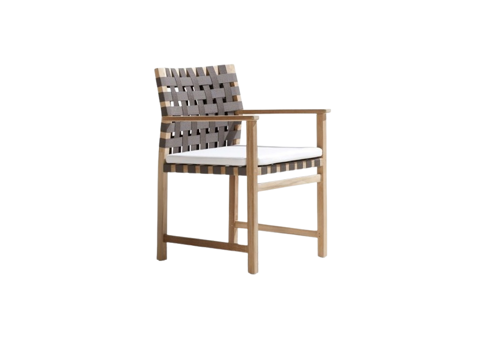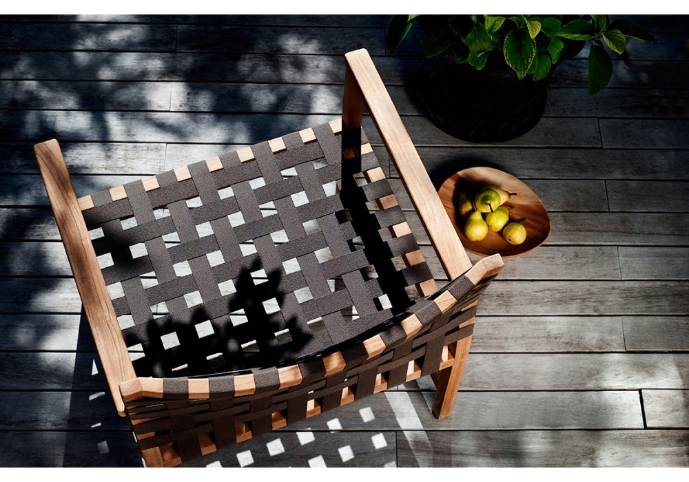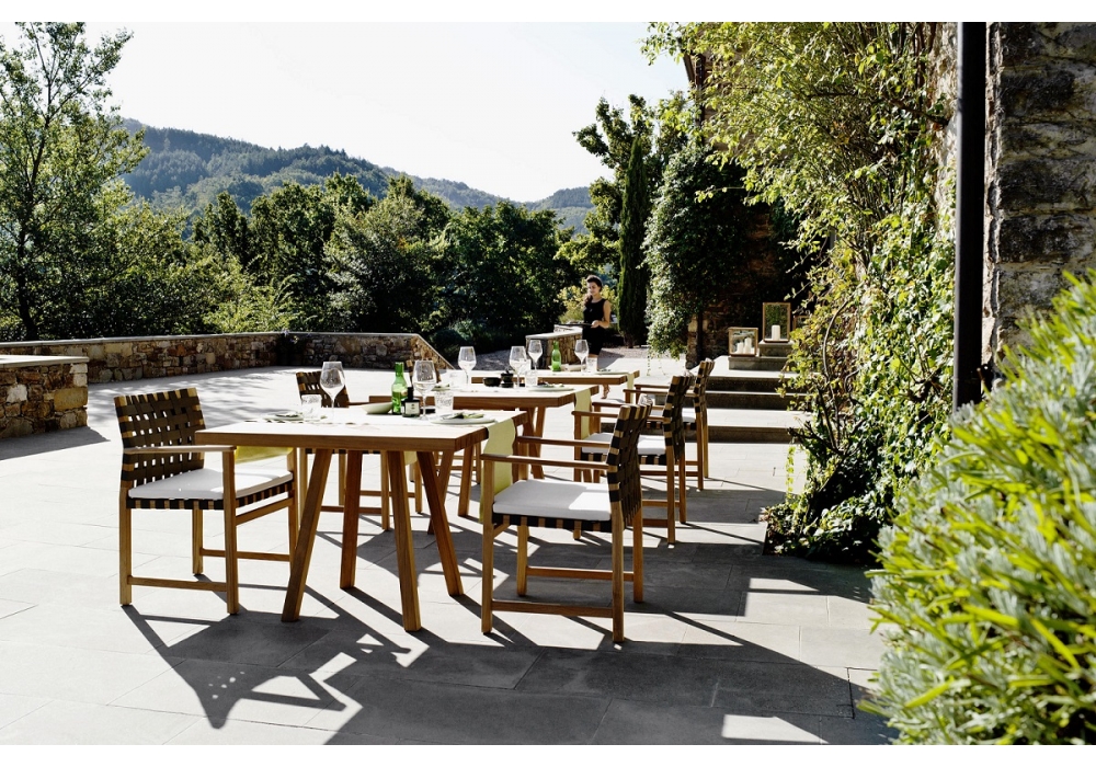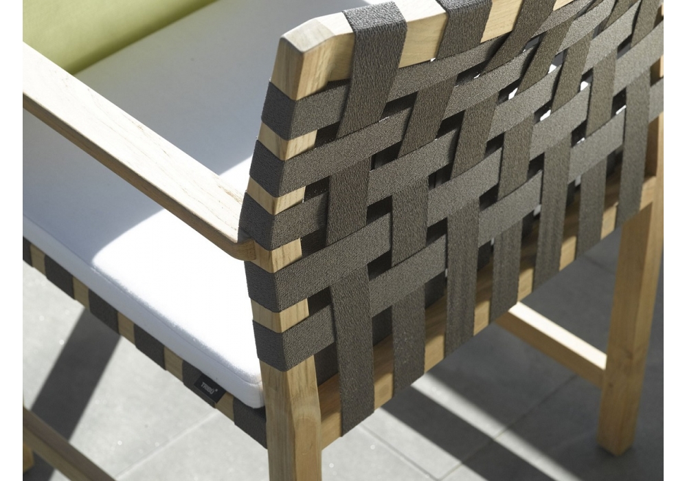 Vis à Vis disegnato da Piergiorgio Cazzaniga per Tribù è una sedia da pranzo con braccioli in teak di piantagione di origine Indonesiana e nastri intrecciati in Canax.