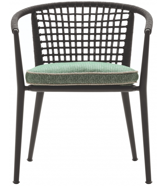 Erica '19 firmata da Antonio Citterio per B&B Italia Outdoor è una sedia per esterni con struttura in alluminio verniciato e intreccio in fibra di polipropilene. Rivestimento in differenti tessuti.