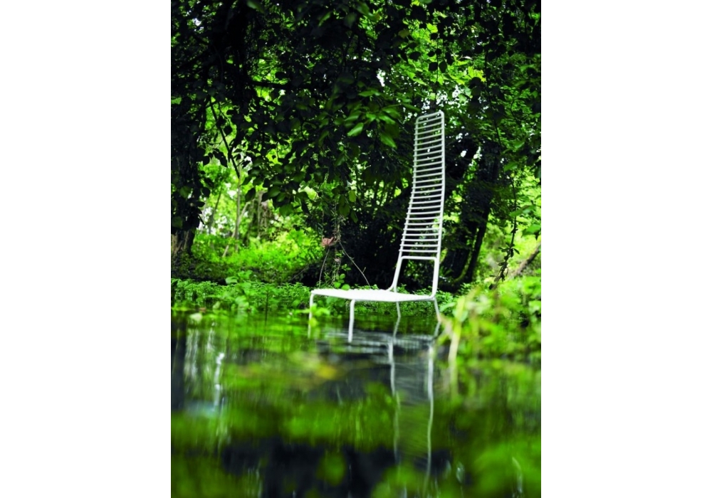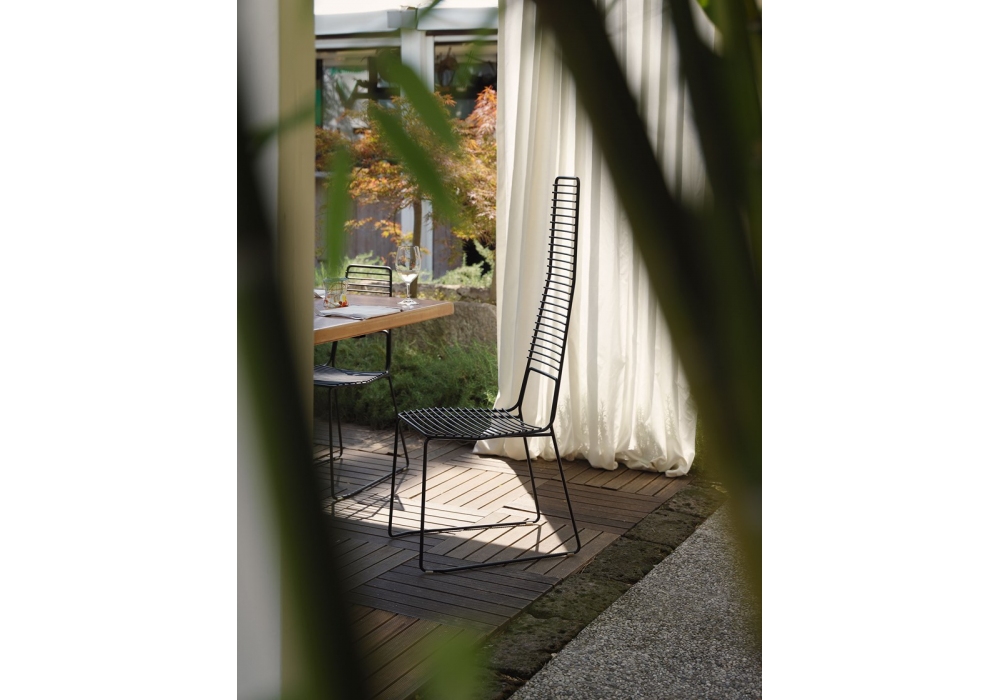 Alieno firmata da GamFratesi per Casamania è una sedia d'esterno con schienale alto realizzata in metallo verniciato goffrato. Disponibile in 2 finiture.