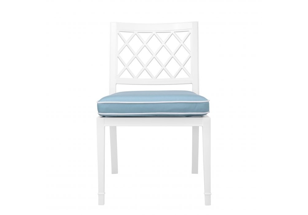 Dining Chair Paladium firmata da Eichholtz è una sedia adatta per un uso da interni o da esterni con telaio dalla finitura bianca e una comoda seduta in tessuto Sunbrella azzurro con profili bianchi.