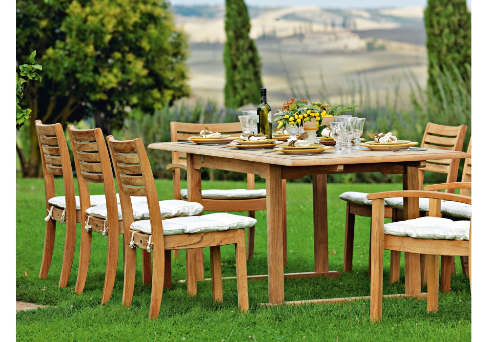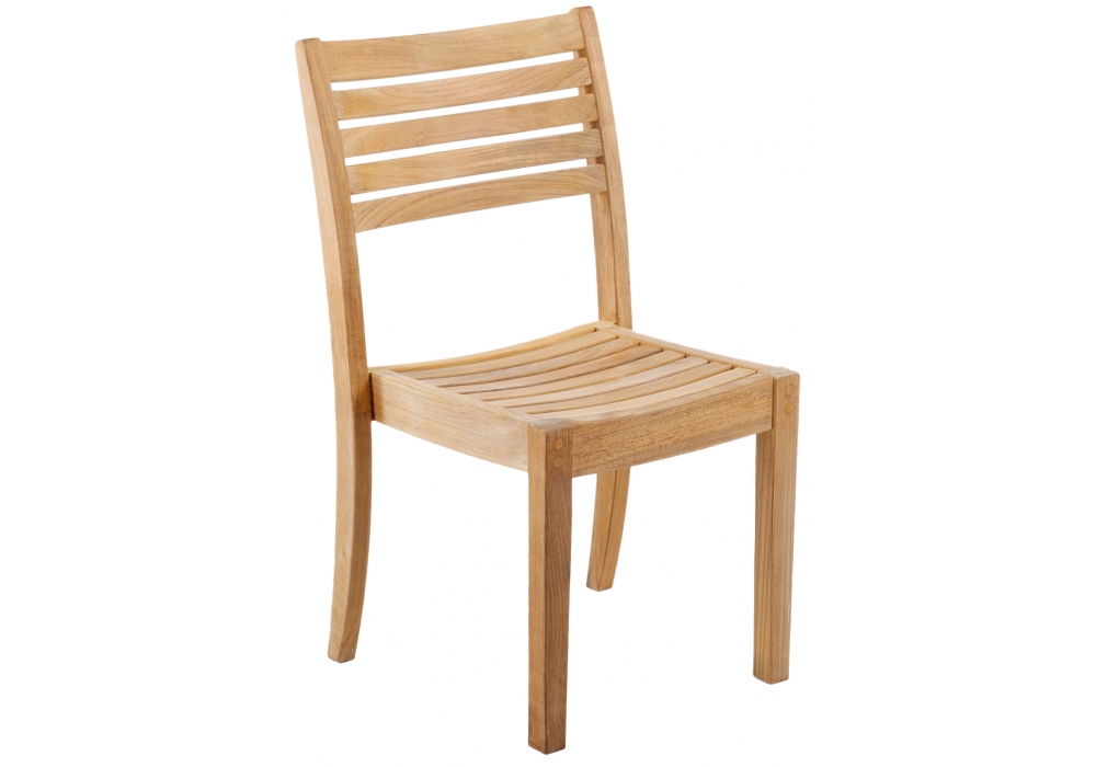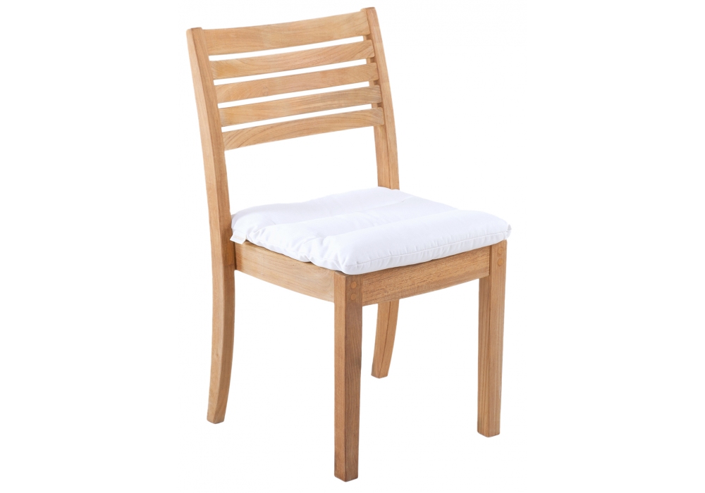 Chelsea prodotta e firmata da Unopiù è una sedia impilabile con struttura in legno teak naturale e cuscinatura in tessuto acrilico color latte.