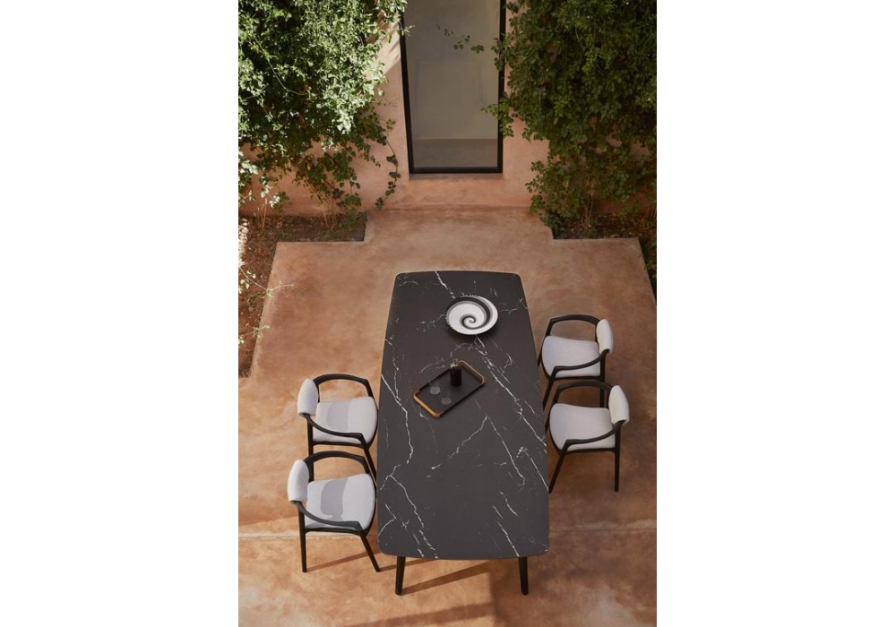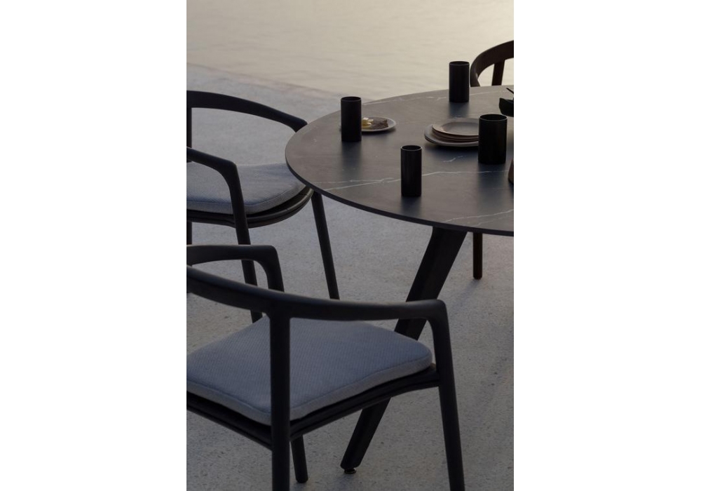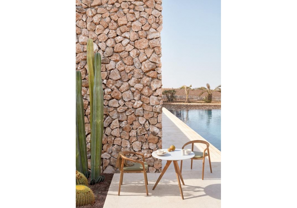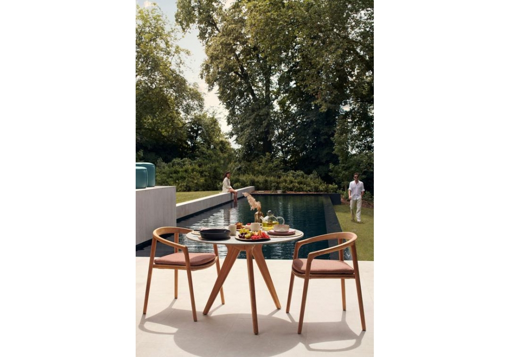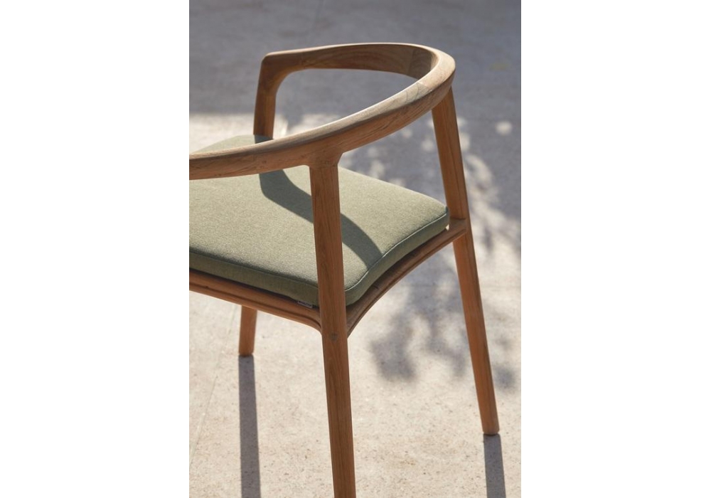 Solid firmata da Lionel Doyen per Manutti è una poltroncina con struttura in teak e rivestimento in differenti finiture.
