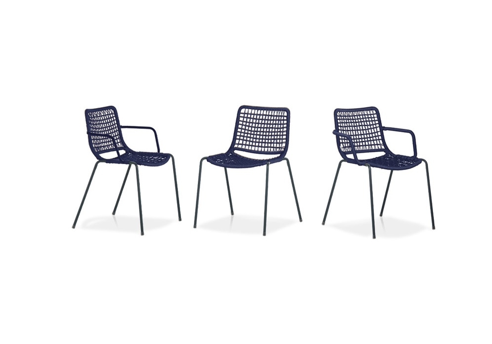 Egao firmata da Toan Nguyen per Potocco è una sedia da esterno con gambe in tubo Inox verniciato e intrecci in cordino sintetico moka o in corda.