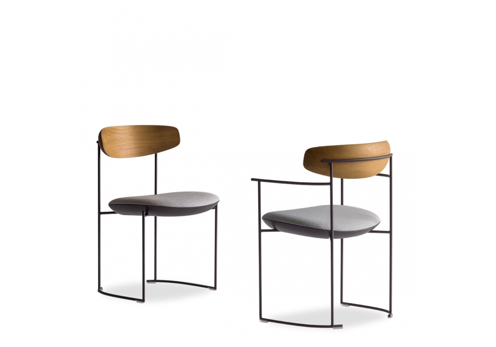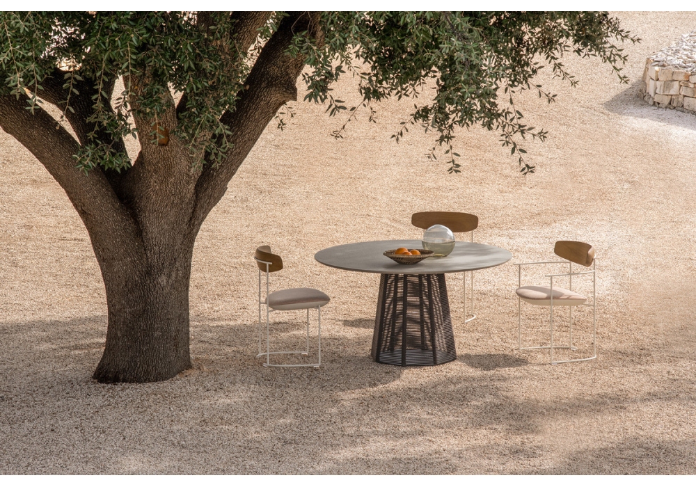 Keel Light Outdoor firmata da M + V per Potocco è una sedia con struttura in tondino di metallo verniciato goffrato, schienale in massello di Iroko e seduta in multistrato di betulla cinghiato in poliuretano espanso ignifugo rivestito in diversi tessuti con guscio sottostante verniciato acrilico per esterno, nello stesso colore e goffratura fine del fusto.