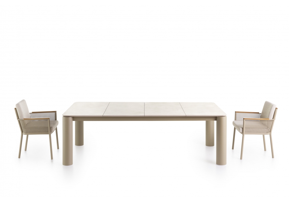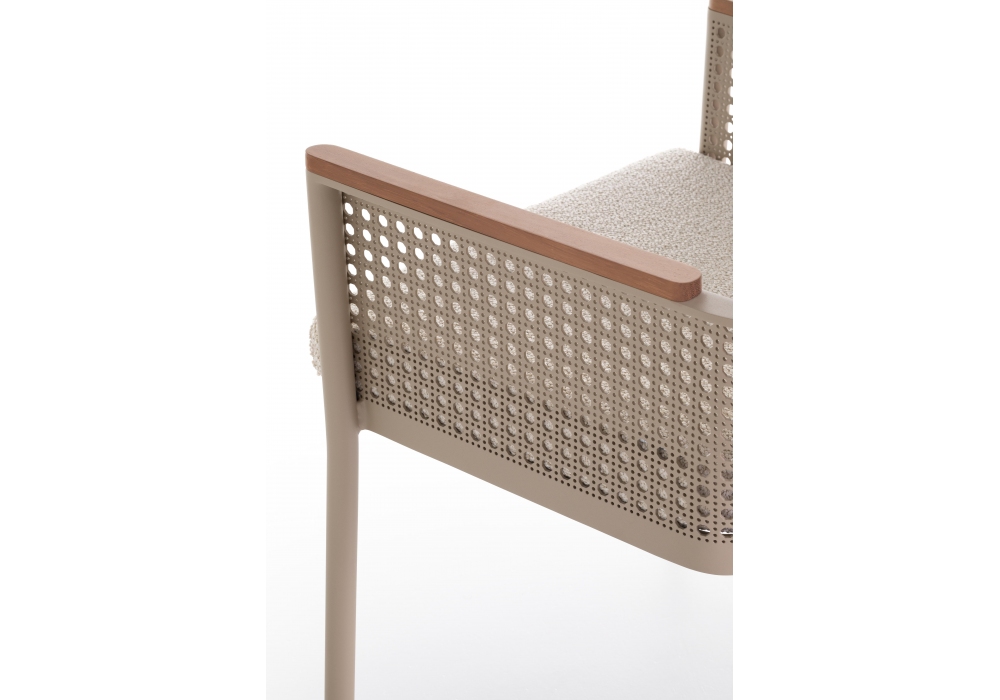 Bosc Sedia firmata da Made Studio per Gandia Blasco è realizzata in alluminio termolaccato, braccioli in legno di iroko e rivestimenti in gomma poliuretanica con fibre di poliestere impermeabil, perfetta per gli spazi esterni. I cuscini sono inclusi. Disponibile in diverse finiture.