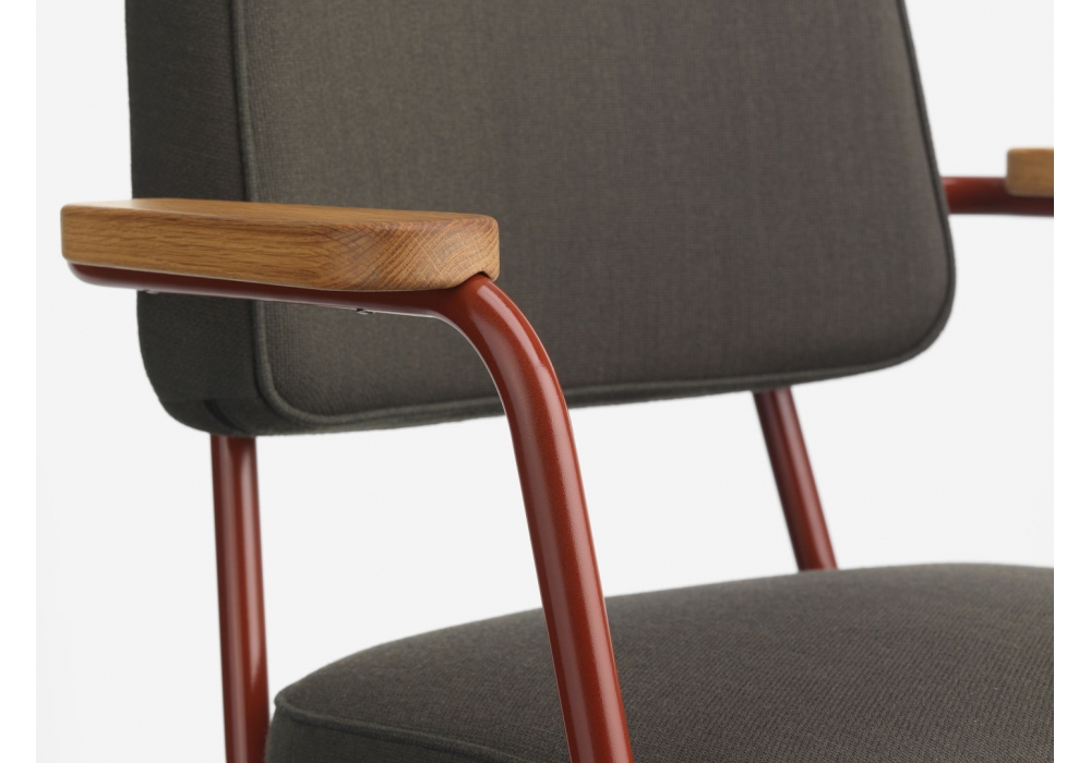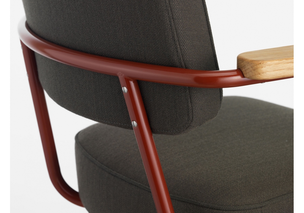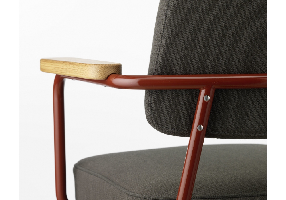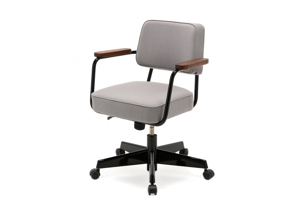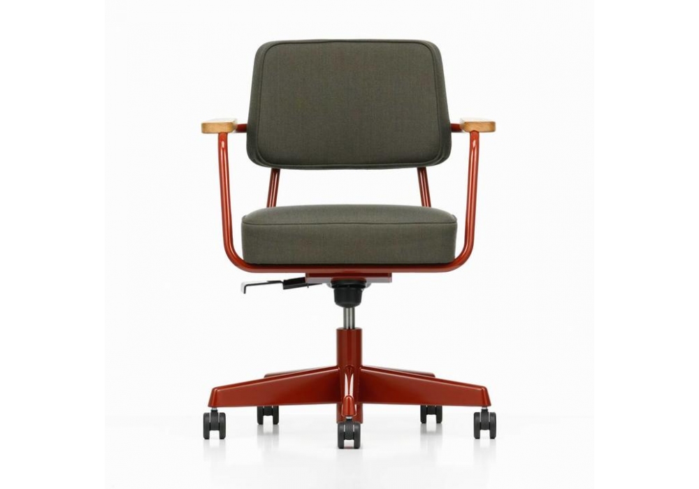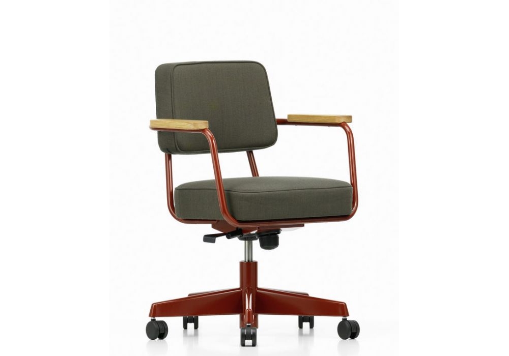 Fauteuil Direction Pivotant Tissu, firmata da Jean Prouvé per Vitra, è una confortevole sedia per ufficio ad altezza regolabile con un‘invitante e abbondante imbottitura. Il meccanismo di inclinazione dello schienale è regolabile in base al peso dell‘utente. Rivestita in tessuto, questa compatta poltroncina girevole fa bella figura non solo in ambienti aziendali ma anche in home office. Sedile e schienale con imbottitura in poliuretano; tessuto di rivestimento Volo in grigio scuro. Braccioli in legno massello con finitura a olio; rovere fumé. Base a cinque razze in lamiera d‘acciaio pressopiegata e tubolare d‘acciaio, verniciati a polvere (finitura liscia) in verde oliva. Dotata di robuste rotelle in colore nero. Inclinazione dello schienale regolabile, bloccabile nella posizione anteriore. Altezza del sedile regolabile in modo continuo tramite pompa a gas.