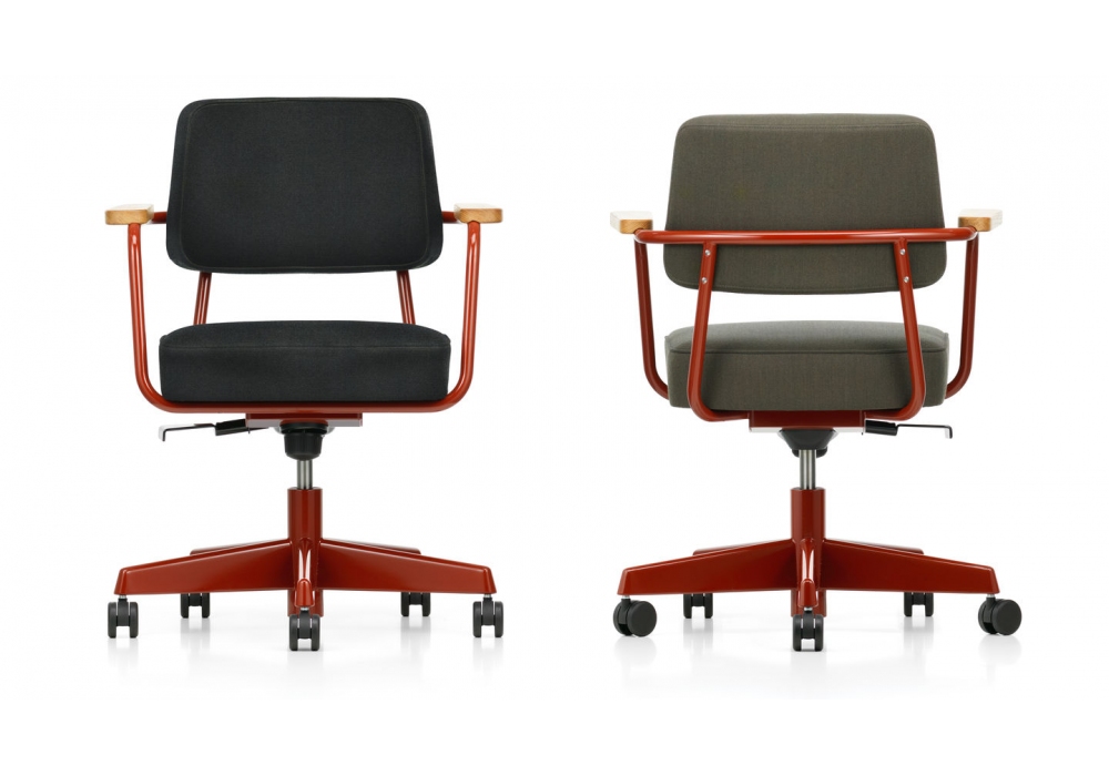 Fauteuil Direction Pivotant Tissu, firmata da Jean Prouvé per Vitra, è una confortevole sedia per ufficio ad altezza regolabile con un‘invitante e abbondante imbottitura. Il meccanismo di inclinazione dello schienale è regolabile in base al peso dell‘utente. Rivestita in tessuto, questa compatta poltroncina girevole fa bella figura non solo in ambienti aziendali ma anche in home office.