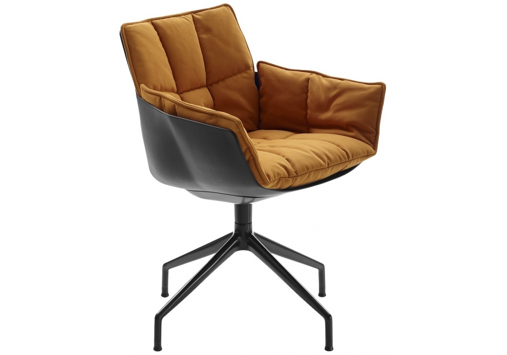 Husk firmata da Patricia Urquiola per B&B Italia è una sedia su trespolo con basamento in fusione d'alluminio spazzolato lucido, verniciato bianco o verniciato nero. Scocca in resina poliuretanica ad alta densità (Baydur®) bianca, antracite, marrone o tortora o cuoio. Rivestimento in tessuto o pelle.