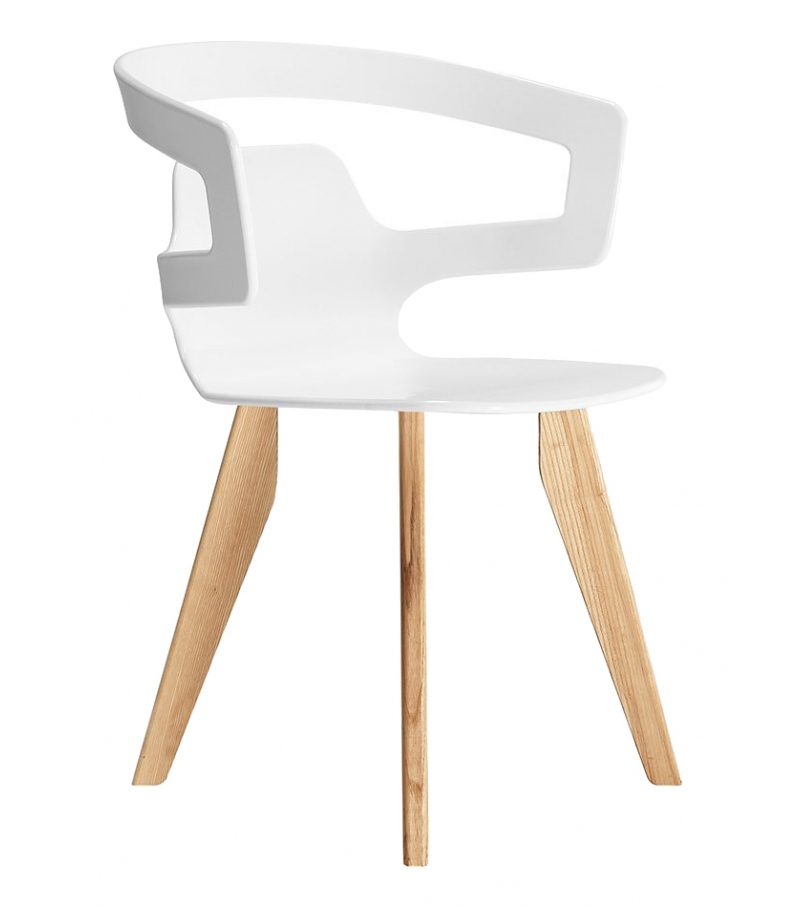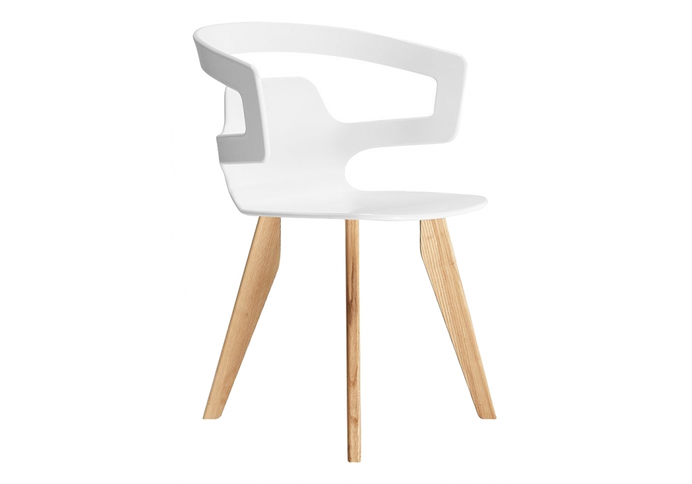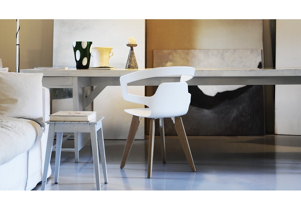 Segesta 558 firmata da Alfredo Häberli per Alias è una sedia con braccioli, scocca in plastica bianca e base in legno di rovere o legno verniciato a poro aperto.