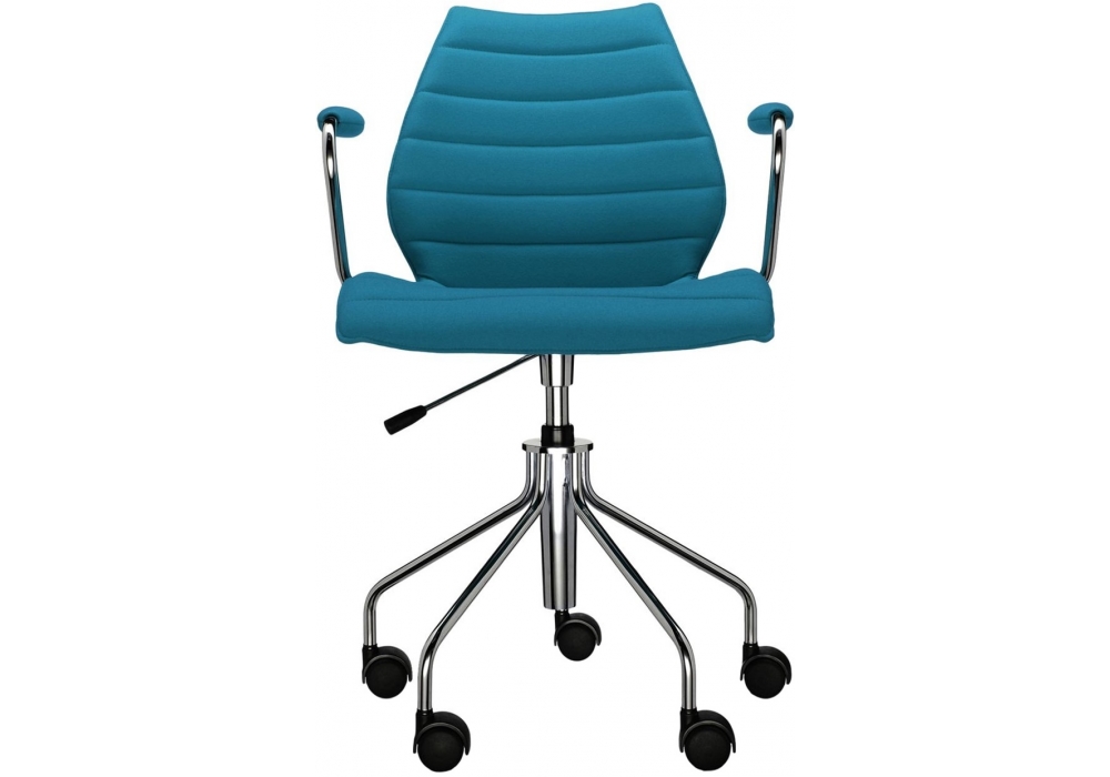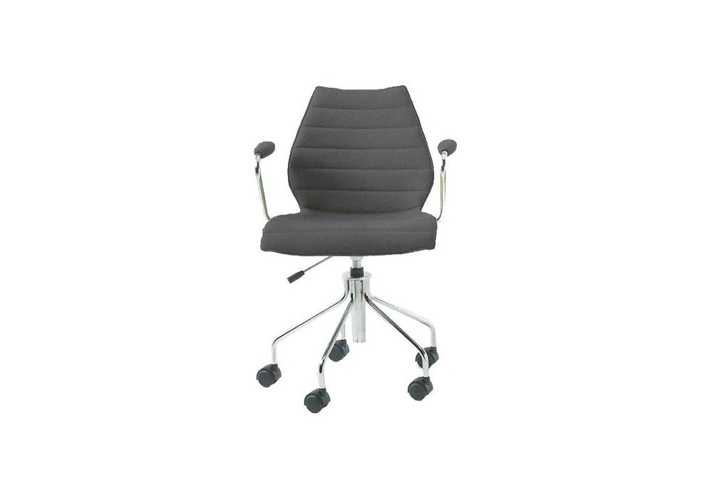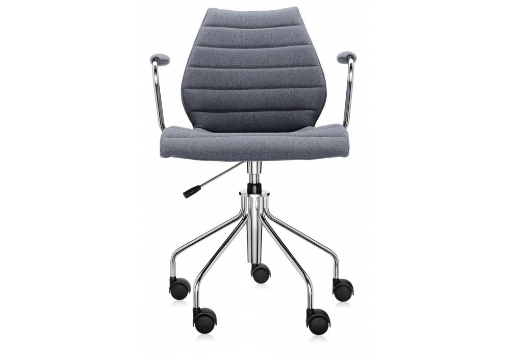 Maui Soft firmata da Vico Magistretti per Kartell è una sedia con ruote realizzata con struttura in acciaio cromato e scocca in nylon rivestito di tessuto.