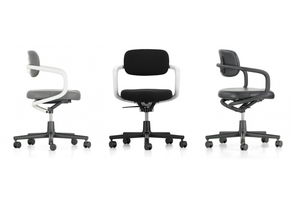 Allstar firmata da Konstantin Grcic per Vitra è una sedia girevole con schienale e seduta rivestiti in tessuto o in pelle in diverse finiture. Base a cinque razze in poliammide nero intenso con ruote doppie.
