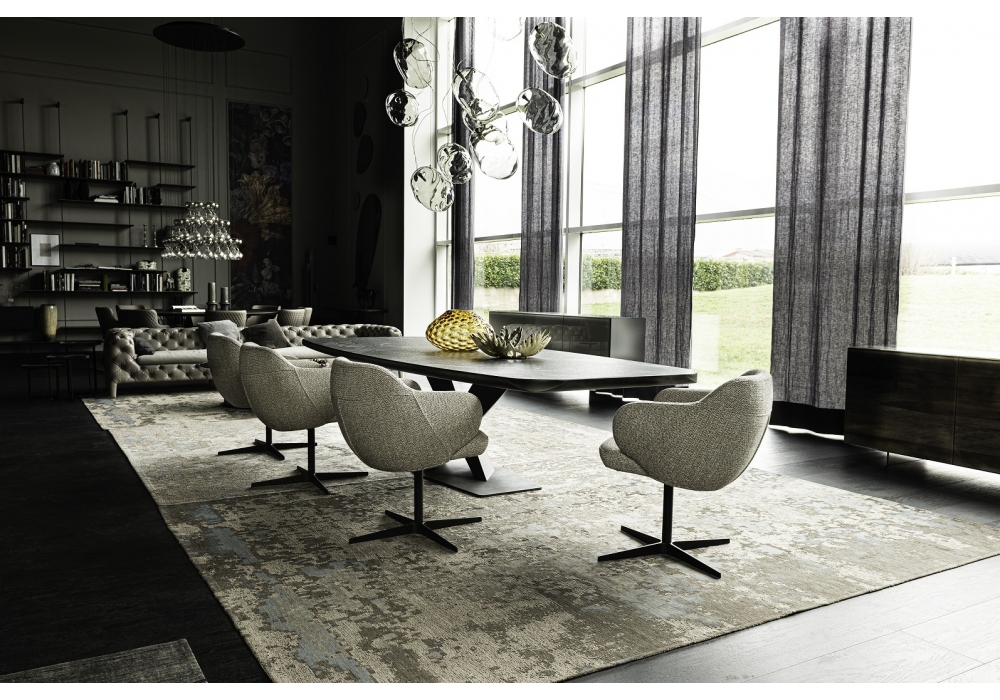 Bombè X firmata da Paolo cattelan per Cattelan Italia è una sedia girevole con base a 4 razze in acciaio verniciato goffrato e rivestimento in tessuto, synthetic nubuck, ecopelle o pelle.
