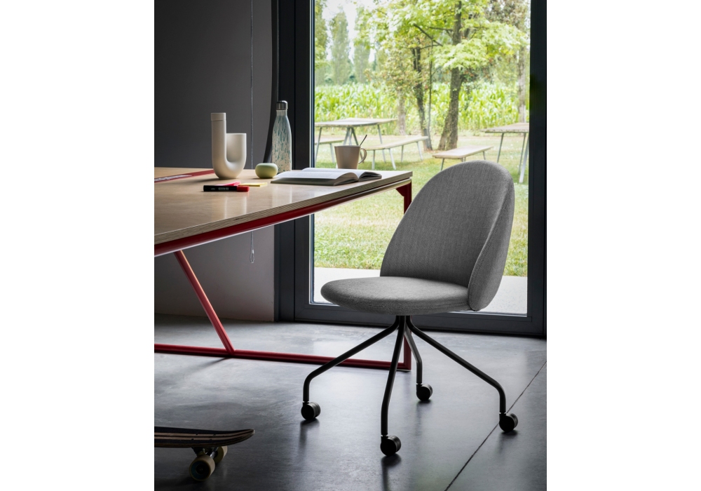 Iola Office firmata da E-ggs per Miniforms è una sedia con scocca in poliuretano flessibile rivestita in tessuto, base con ruote. Disponibile in diverse finiture e nella versione con o senza braccioli.