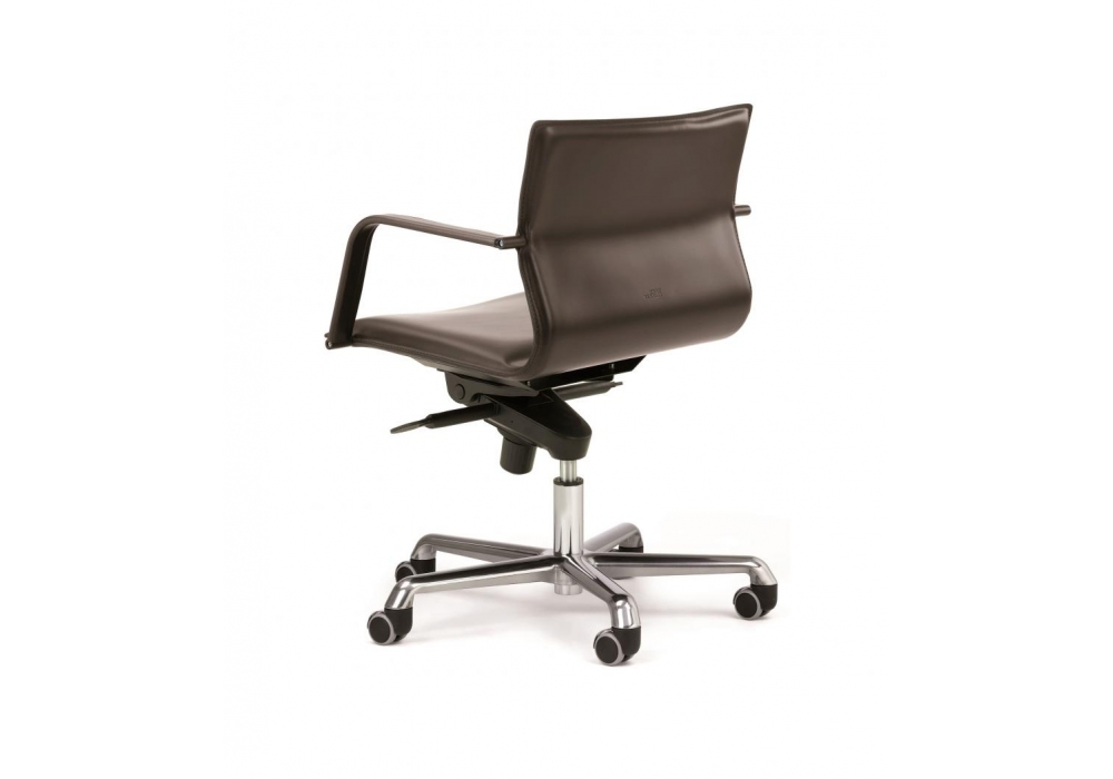 Lybra firmata da RedCreative per Enrico Pellizzoni è una sedia con struttura in tubolare d’acciaio, sedile, schienale e braccioli rivestiti in cuoio o pelle, base con ruote. Meccanismo di regolazione altezza a gas e basculante. Disponibile in diverse finiture e nella versione con schienale alto o basso.