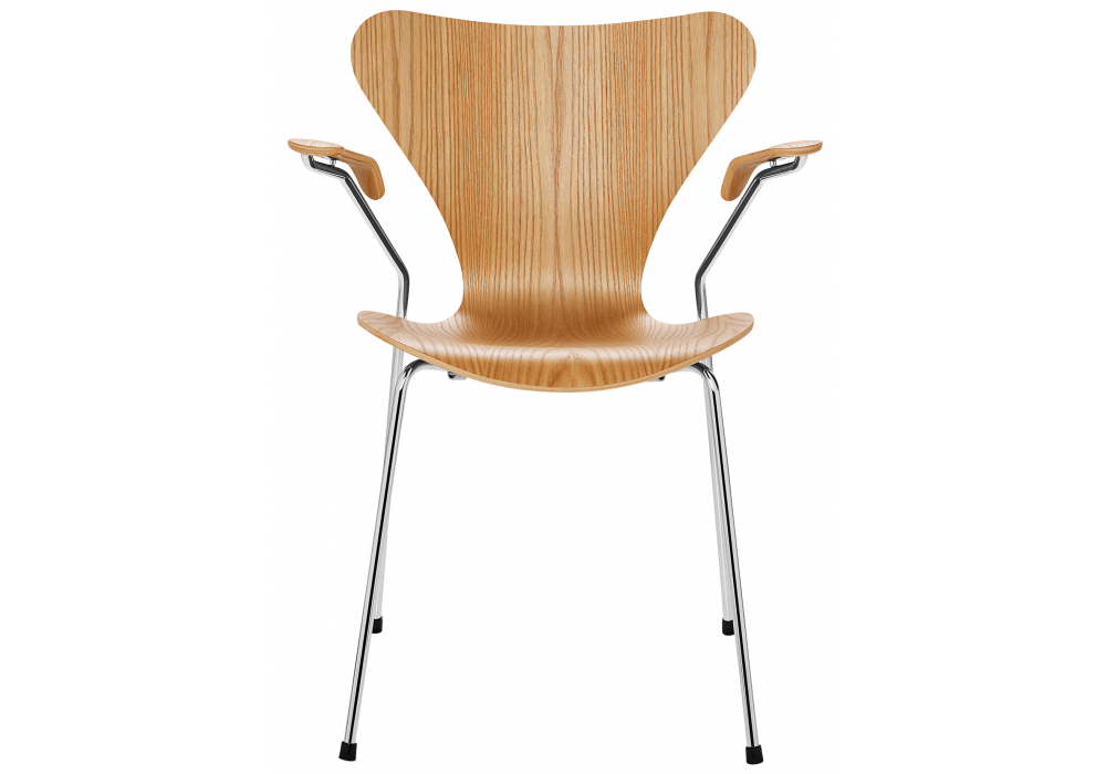Series 7 firmata da Arne Jacobsen per Fritz Hansen è una sedia con braccioli realizzata con scocca in legno impiallacciato o in frassino laccato o colorato e gambe in tubolare d'acciaio cromato o verniciato a polvere. Disponibile in diverse finiture.