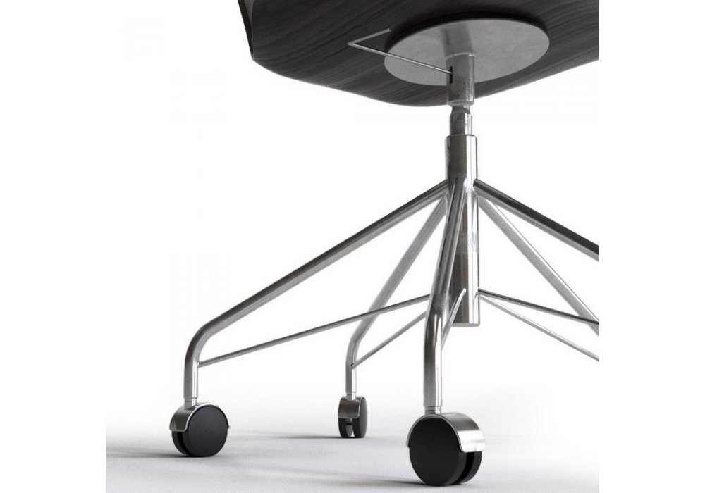 Series 7 firmata da Arne Jacobsen per Fritz Hansen è una sedia girevole con braccioli realizzata con scocca in legno impiallacciato o in frassino laccato o colorato e base con ruote a 5 razze in tubolare d'acciaio cromato o verniciato a polvere. Disponibile in diverse finiture.