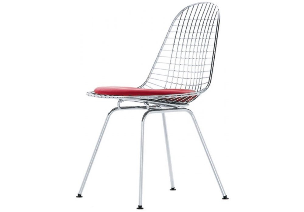 Vitra Wire Chair sedia: Con la Wire Chair, Charles e Ray Eames effettuarono variazioni sul tema della scocca ergonomica monopezzo nella sua forma più trasparente. Le sedie sono disponibili senza imbottiture del sedile e dello schienale dette "Bikini". Schienale e superficie seduta: filo d'acciaio cromato, modellato a saldato. Imbottitura: sedie senza imbottitura, solo cuscini o imbottitura integrale. Imbottitura nei tessuti Hopsak o pelle. Basamento: basamento a 4 gambe. Pattini: con pattini per moquette o a scelta con feltrini per pavimenti duri.